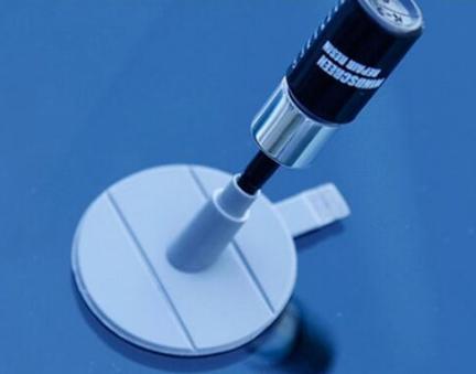 4、取下注射器然后再次插入定位贴,挤压注射器阀门,可以把修复液推进裂缝里。大约一刻钟后,让修复液充分渗入裂纹。