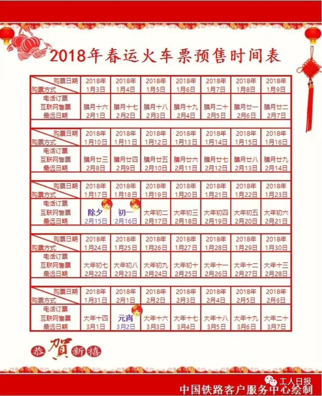 近日,中国铁路客户服务中心发布公告称,全国铁路新运行图编制工作已全部完成,自12月12日起,全国主要干线旅客列车车票互联网、电话订票预售期恢复为30天。12月12日恢复火车票预售期后,旅客就可以购买元旦火车票。那么2018春节火车票怎么买?1月17日就可以抢除夕的火车票,更多戳下图↓
