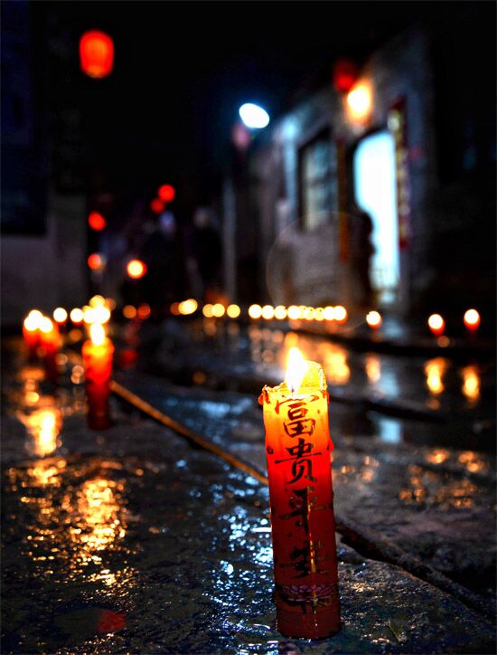 随着夜幕降临,家家户户都在自家门口点燃一排排红烛,红烛的光亮将石板街延续成一条长长的祥龙。这是当地祖祖辈辈延续下来的习俗,为的是祈求风调雨顺,幸福平安,新的一年日子红红火火。