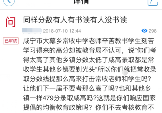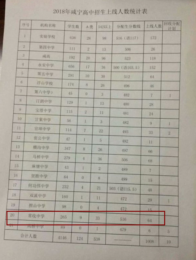 从这位网友提供的一张《2018咸宁高中招生上线人数统计表》中可以看出,大幕乡常收中学录取分数为516分,而其他乡镇中学录取分数基本为470分到500分之间。其实,除了乡镇中学录取分数有差异外,也有市民反映城区中学之间也有差异。市民殷女士向记者反映:同样是城区,咸安区实验学校录取分数是516分,永安中学却只要500分。