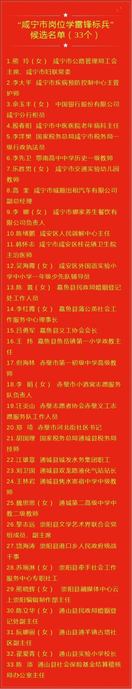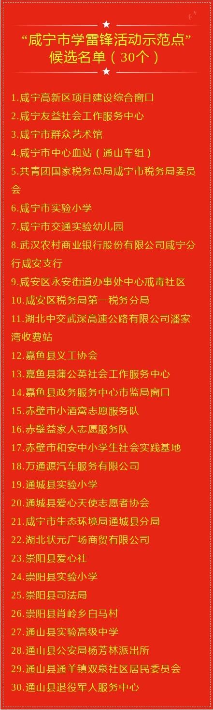 (云上咸宁编辑报道)3月3日,为大力弘扬雷锋精神,不断培育和践行社会主义核心价值观,推动岗位学雷锋活动常态化,营造争做新时代雷锋的浓厚氛围,市委宣传部拟评选出30个“咸宁市学雷锋活动示范点”和33名“咸宁市岗位学雷锋标兵”(具体名单附后),现将评候选名单面向社会公示,接受群众和社会监督。