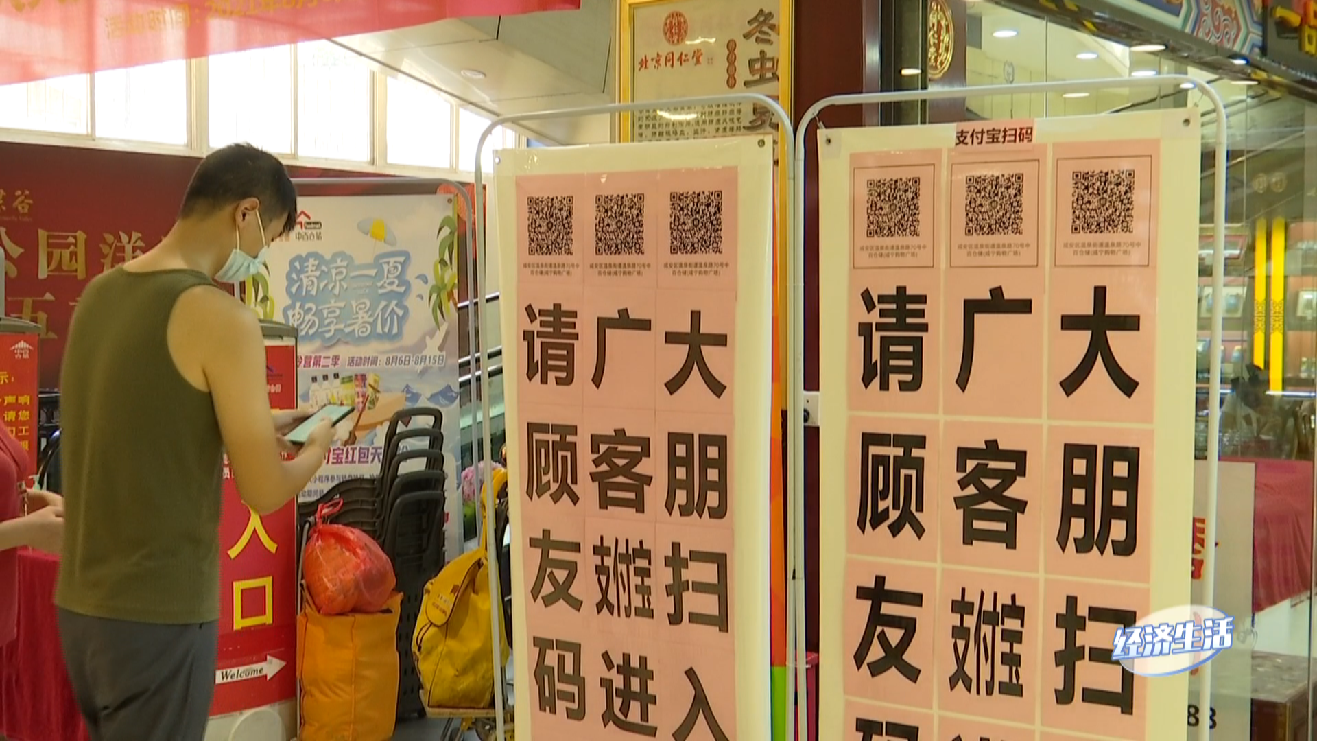 来到温泉中百仓储超市,可以看到门口树立的告示牌和二维码十分醒目,在工作人员引导下,市民扫码、测温,并佩戴好口罩后,有序进入超市选购。