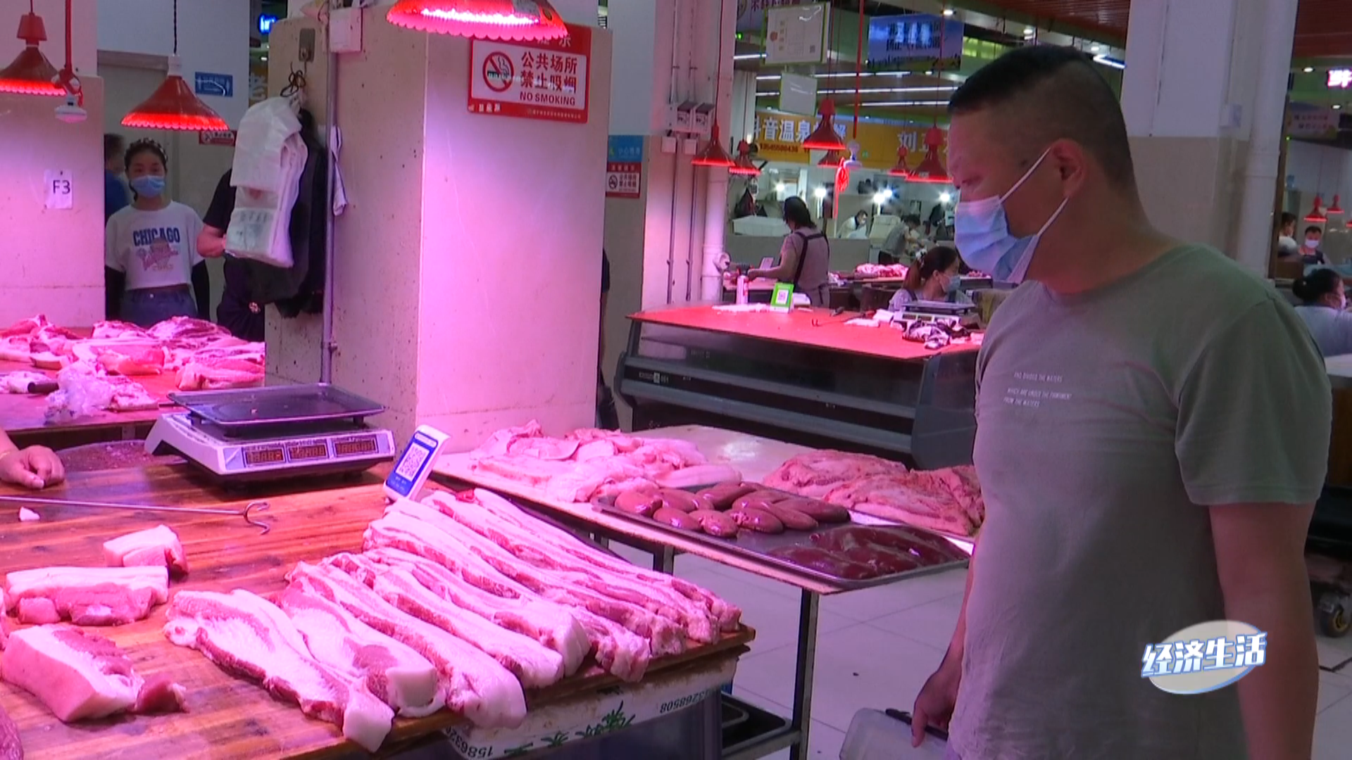 今天猪肉卖得非常好,还没到(上午)10点就只剩几块了!肉类价格稳定,货源充足。