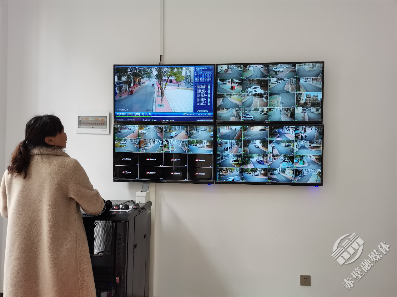 这栋崭新的大楼相关设施没有全部完工,里面的设施暂时还没到位,一楼是物业管委会办公大厅,摆放了监控设备,一名物业人员正在查看监控,通过大屏幕,可以清晰的看到小区各个路口以及楼栋的情况。