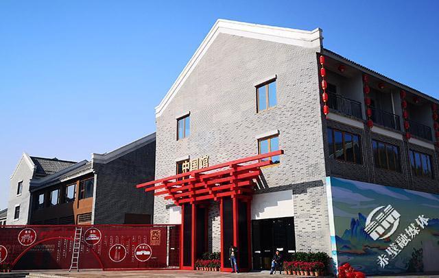 在展馆的门头设置了中国红色的榫卯结构装置,充分展现了鼎盛恢弘的中华文化精神与气质。