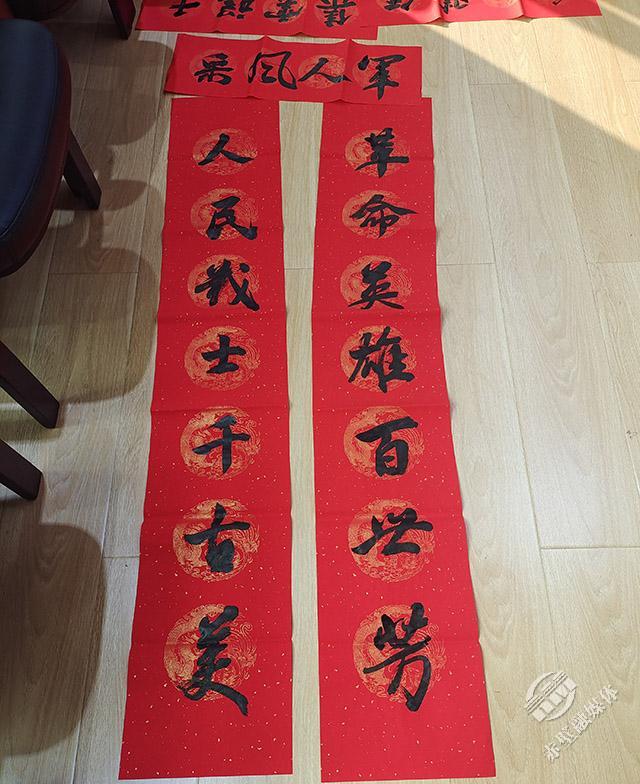 活动现场,八位书法家兴致勃勃,挥毫泼墨,一幅幅各种形式书体书写的饱含深情、兵味浓浓、传统文化气息丰富的春联和“福”字,寄托着对退役军人的祝福。