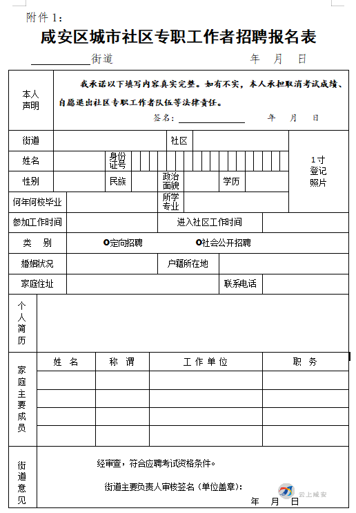附件1:《咸安区城市社区专职工作者招聘报名表》