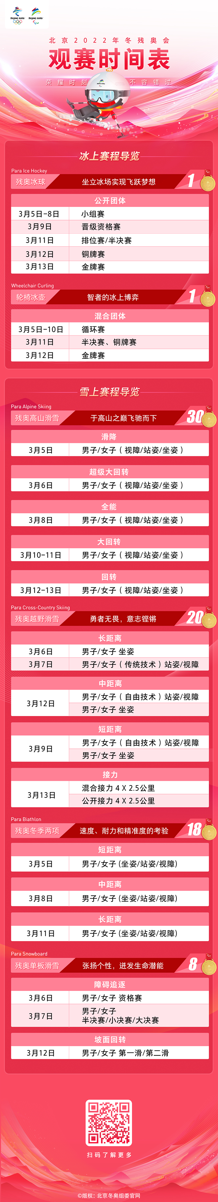 北京2022年冬残奥会即将迎来首个比赛日,冬残奥运动员们在赛场上的拼搏,同样值得我们关注!6个大项,78个小项,这里不仅是挥洒汗水的赛场,更是展示体育精神的殿堂。收藏这张观赛时间表,为冬残奥运动员们加油!