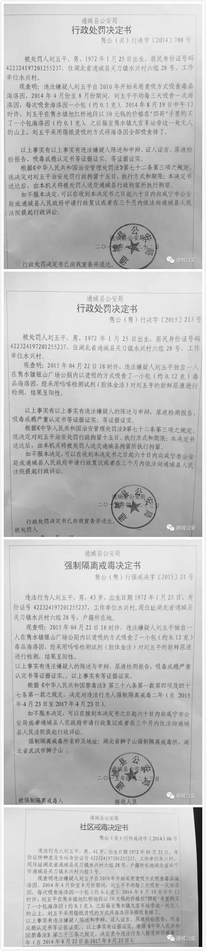 因刘五平系吸毒人员,曾因吸毒、盗窃被公安机关多次打击处理(2013年7月1日因盗窃被行政拘留15日;2014年8月22日因吸毒被行政拘留15日,社区戒毒三年;2015年4月23日因吸毒被决定强戒二年,4月27日因盗窃被刑事拘留,9月1日因风湿性心脏病、心肌炎、肺炎等疾病被取保候审),遂将刘五平传唤至派出所进行尿检。