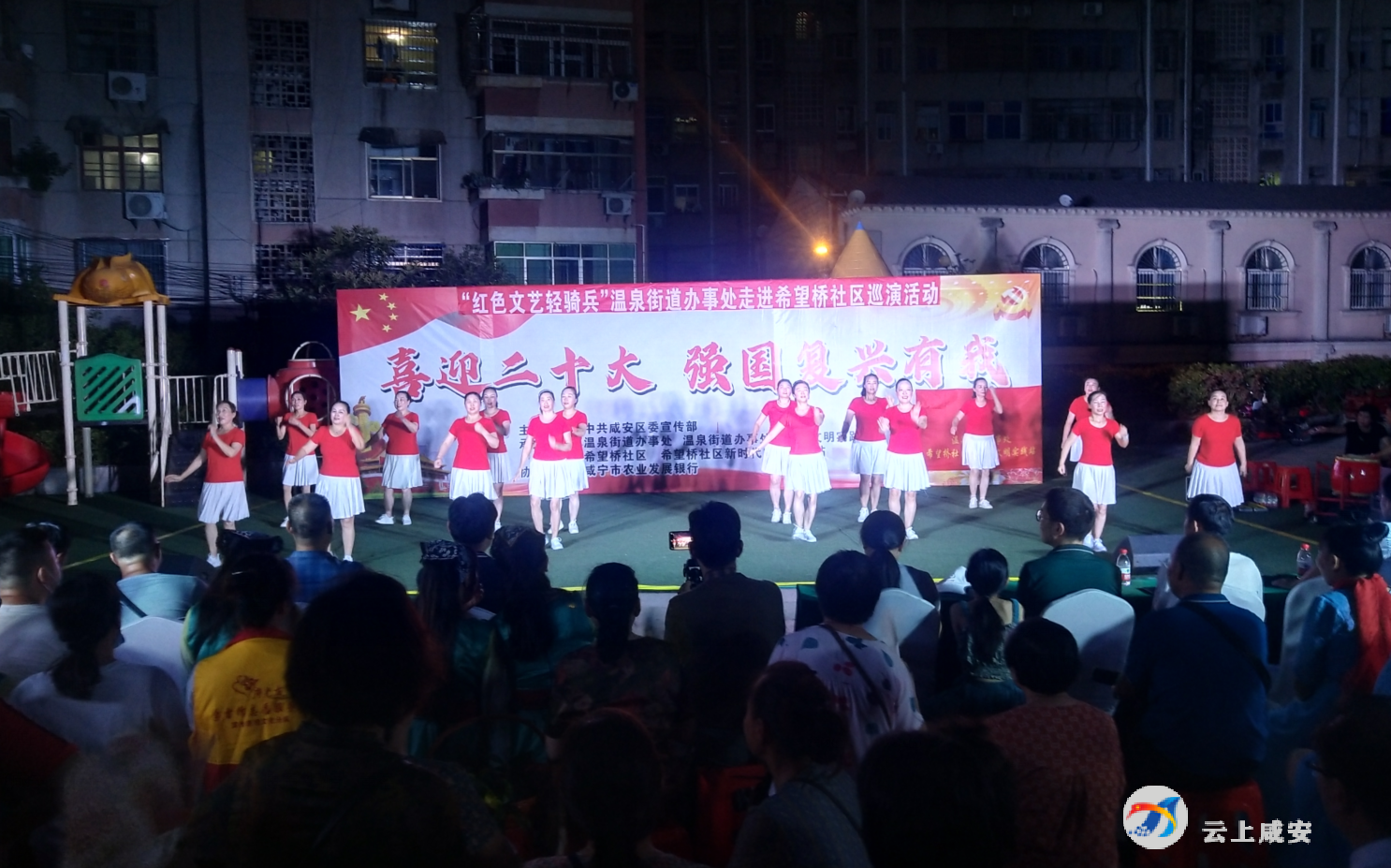 云上咸宁报道(记者 胡晓轩 通讯员 傅勇)为进一步激发市民的主人翁意识,以更加文明的言行、良好的素养积极主动参与、支持文明城市创建,喜迎二十大。8月15日晚,由咸安区委宣传部主办,温泉街道办事处、温泉街道新时代文明实践所等单位承办的“喜迎二十大 强国复兴有我”创建全国文明城市专场文艺演出在希望桥社区举行。