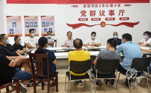 9月5日晚,在赤壁市赤马港街道汪家堡社区印象5号公馆小区内,美好环境与幸福生活共同缔造圆桌会上,业主、业委会主任、物业经理、社区书记等人正在热烈交谈。