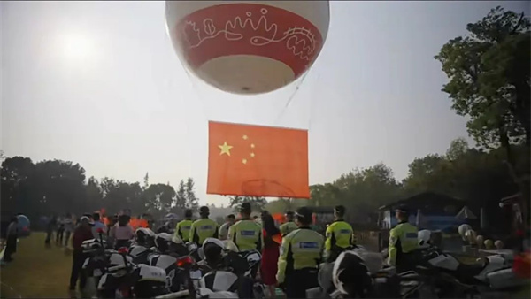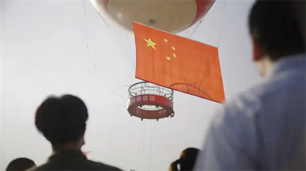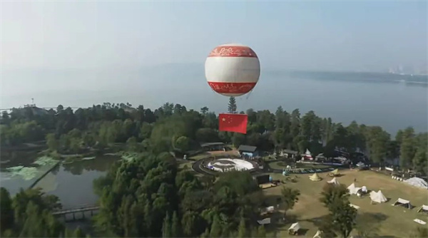 伴随交响乐团奏响《我和我的祖国》,一面巨幅五星红旗装挂在东湖氦气球上冉冉升起,承载着大家心中的美好祝愿飘扬在东湖73米高空上,景区内游客抬头可见。鲜艳夺目的红旗与东湖的秀美山水、波光粼粼交相辉映,凝聚了世界的目光,也传递着江城儿女对祖国富强、人民幸福、生活美好的期许。