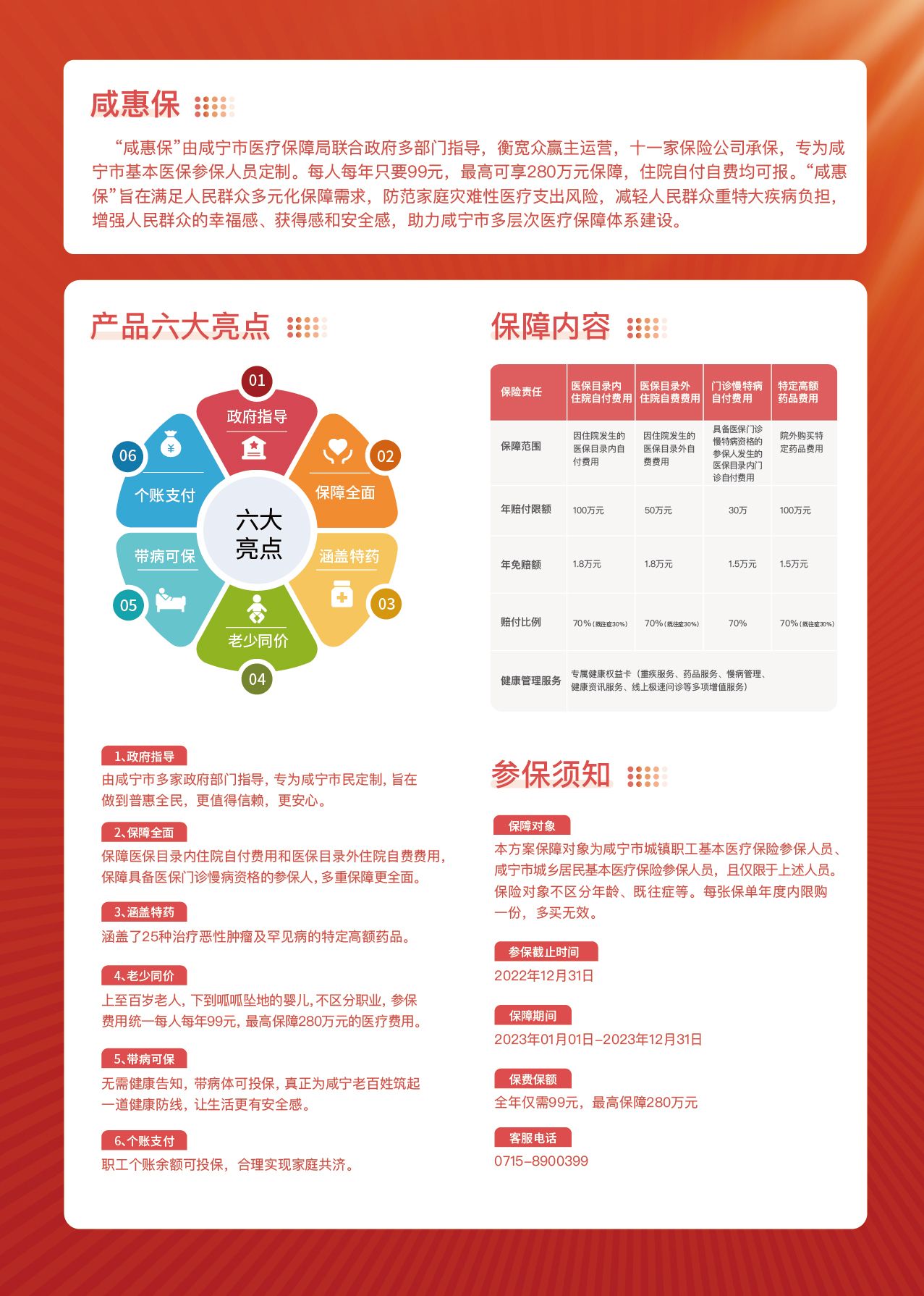 11月14日,记者从咸宁市政府新闻办召开的“咸惠保”项目启动新闻发布会上获悉,由政府指导,商业保险公司开发的、符合咸宁本地政策实际的惠民型商业补充医疗保险——“咸惠保”于今日上线。每人每年保费99元,可保障医保政策内、外个人负担的住院费用部分,癌症、重症等带病人群均可参保,最高可赔280万。