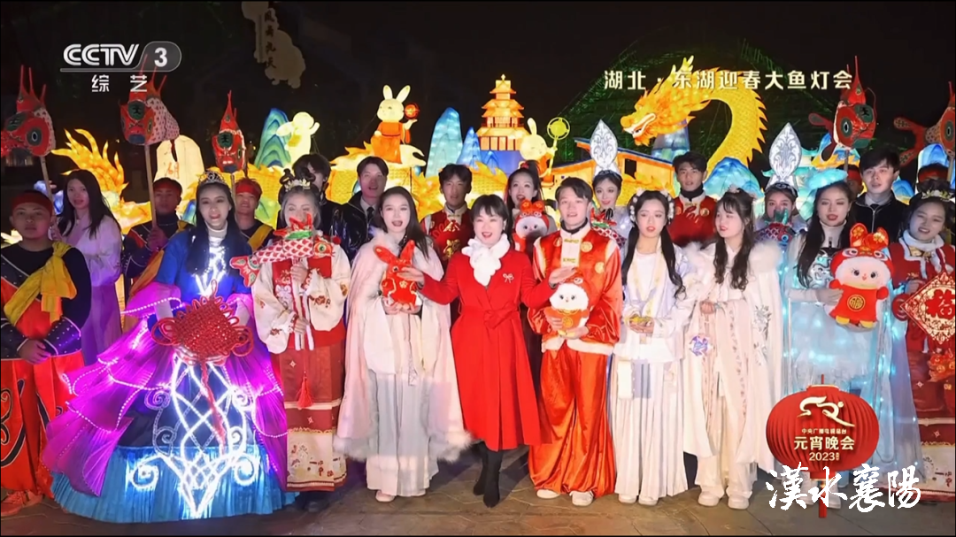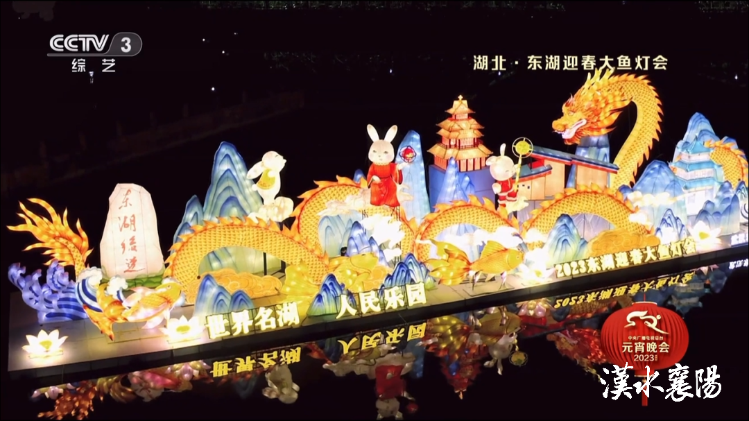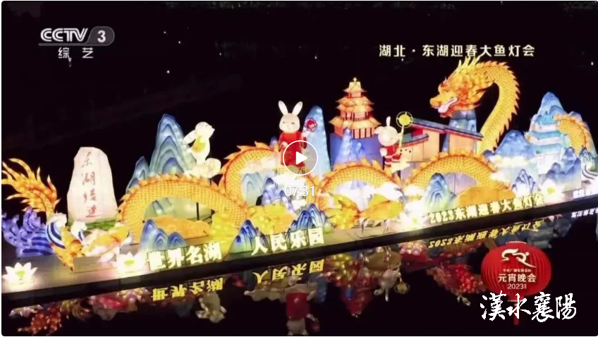 “此刻我正在东湖迎春大鱼灯会的现场。说起武汉,长江、汉江穿城而过,百余座湖泊星罗棋布。吉祥的锦鲤和生肖兔年兔子造型打造了35万方的花灯,7米长的超大鱼灯率领群鱼在夜色中闪烁飞舞。”