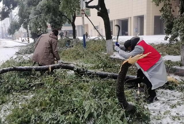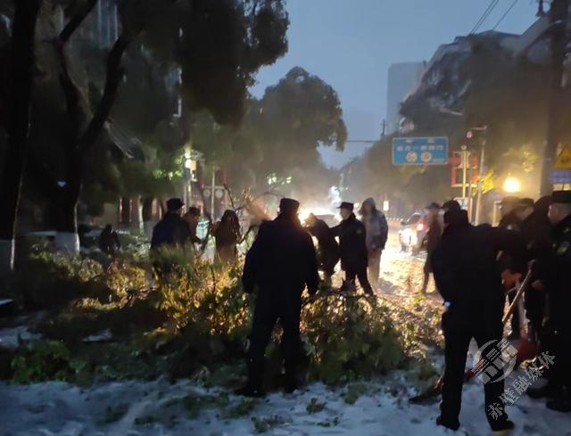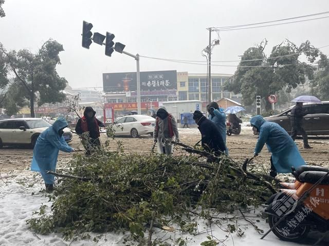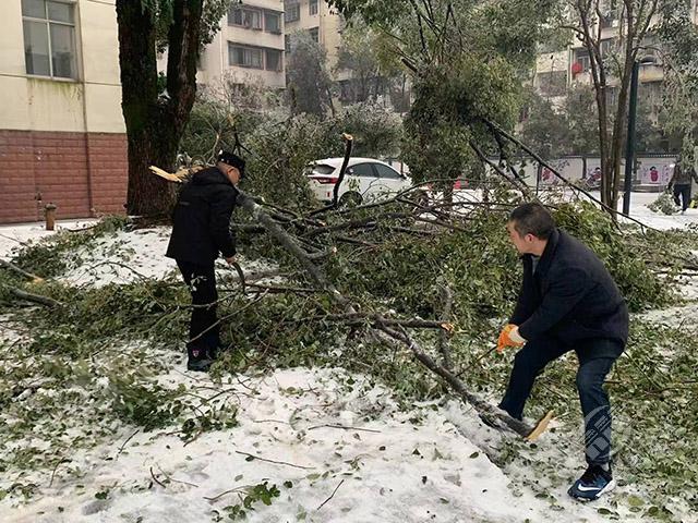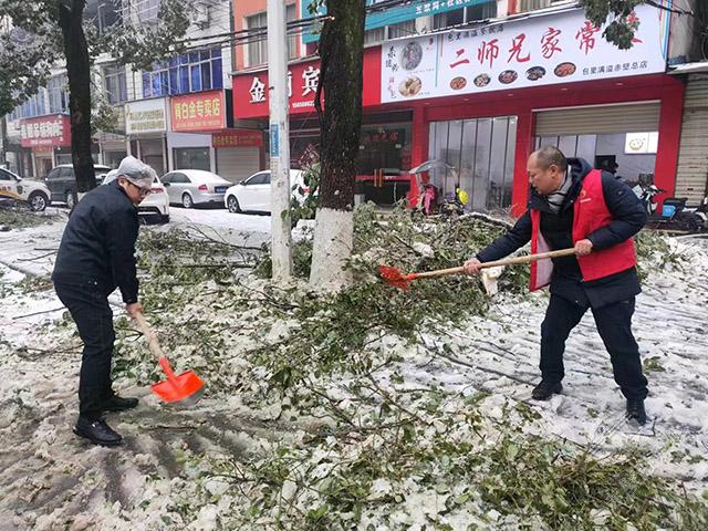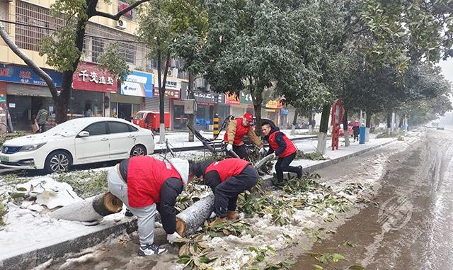赤壁市鲫鱼桥社区全体党员干部到路面小区清理树枝积雪,以尽快恢复居民的正常出行。(蒋丽华)