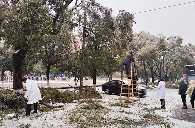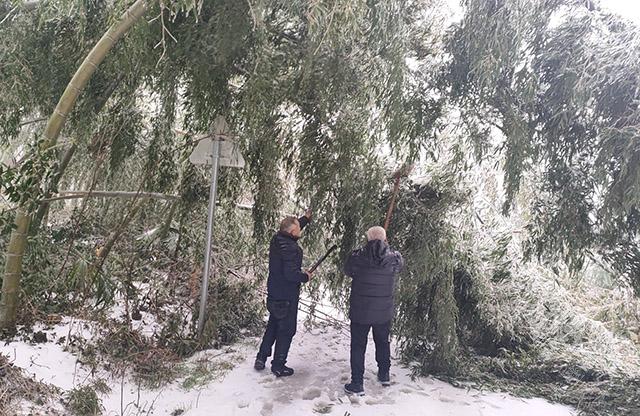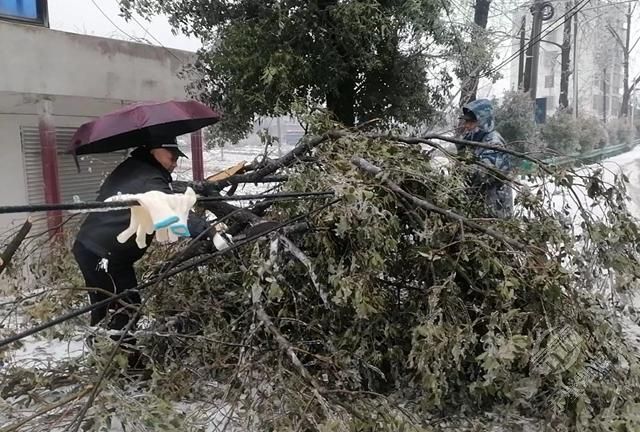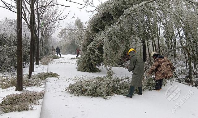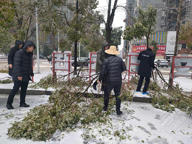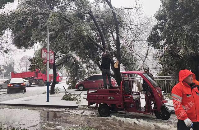 面对低温恶劣天气,为保障市民的平安出行和消除安全隐患,赤壁市商发集团全体干部职工第一时间投入到扫雪除冰、清理断枝的战斗中,全力以赴扫除障碍。(李略)
