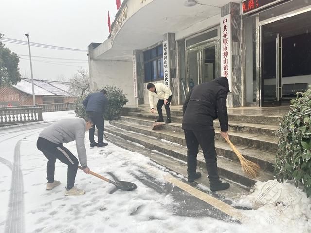 赤壁市神山镇安排干部及时清扫门口积雪,驻村干部及时下村查看村组情况,清理道路伏倒树干。(王雪琴)
