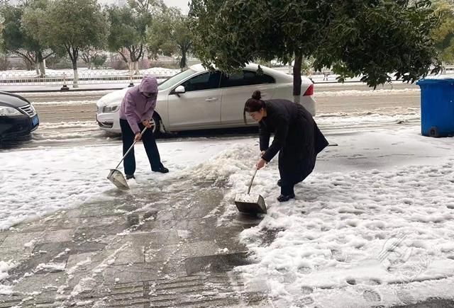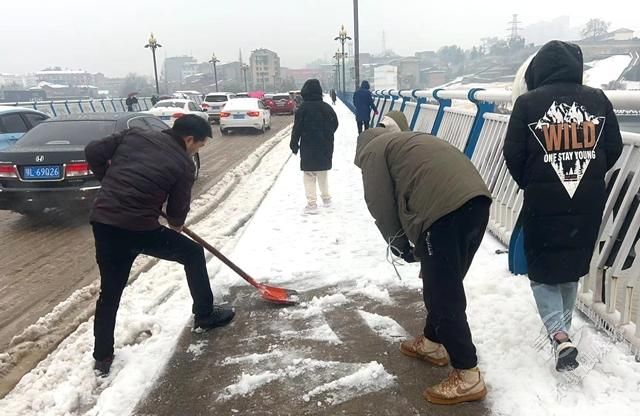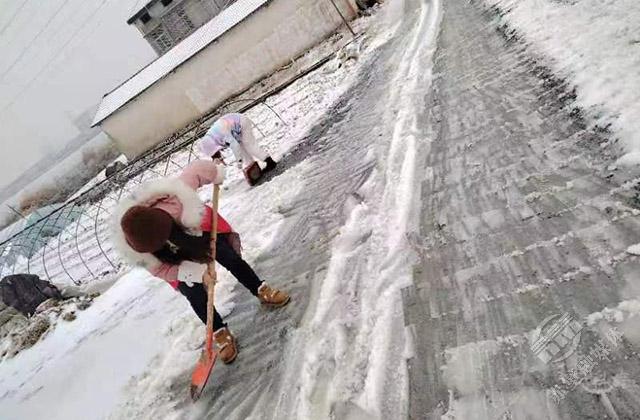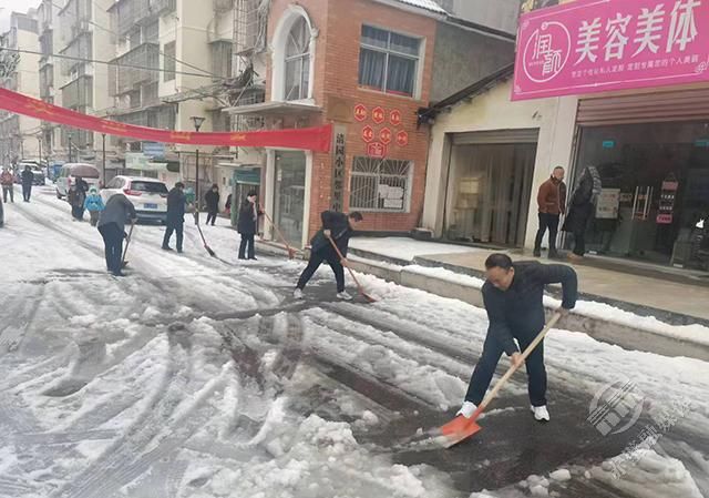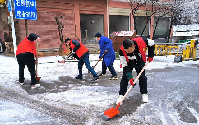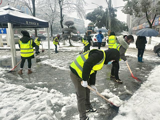 赤壁市和尚岭社区干部和志愿者们冒着凛冽的寒风,带着铁锹、扫帚等工具,在辖区主干道和小区内清扫积雪,清理压断的树枝,及时为居民扫出一条条安全出行的道路。社区工作人员还不断提醒往来的居民天冷路滑,注意出行安全。(曾彩霞)