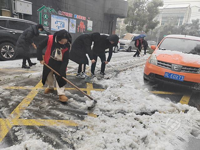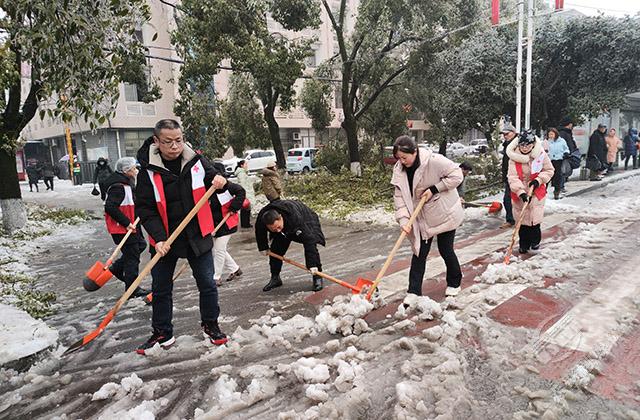 赤壁市湿地管理处组织机关全体和小区居民在包保小区开展清雪除障活动,确保小区居民出行方便。(芮春和)