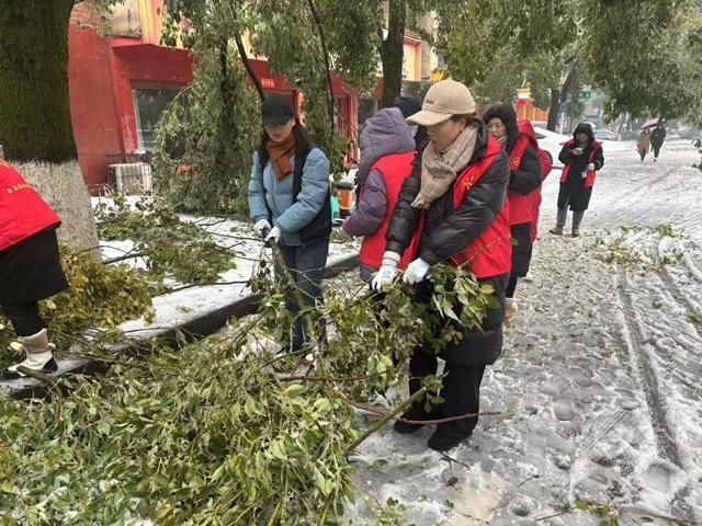 赤壁市税务局组织党员下沉社区,清理包保小区门前积雪和残枝。(朱梦和)