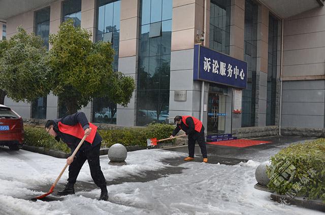 赤壁市人民法院以雪为令、迅速行动,党员干部组成“党员先锋队”,对院内、大门通道、台阶等处进行清雪除冰,清理出过路通道,并在易滑处铺上防滑垫,为来院办事当事人提供方便。(黄素)