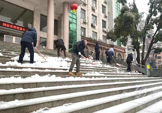 赤壁市民政局组织干部职工对办公楼前步梯和路面积雪进行清扫。(董文耀)
