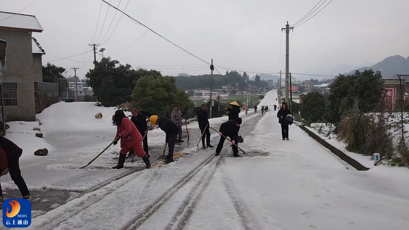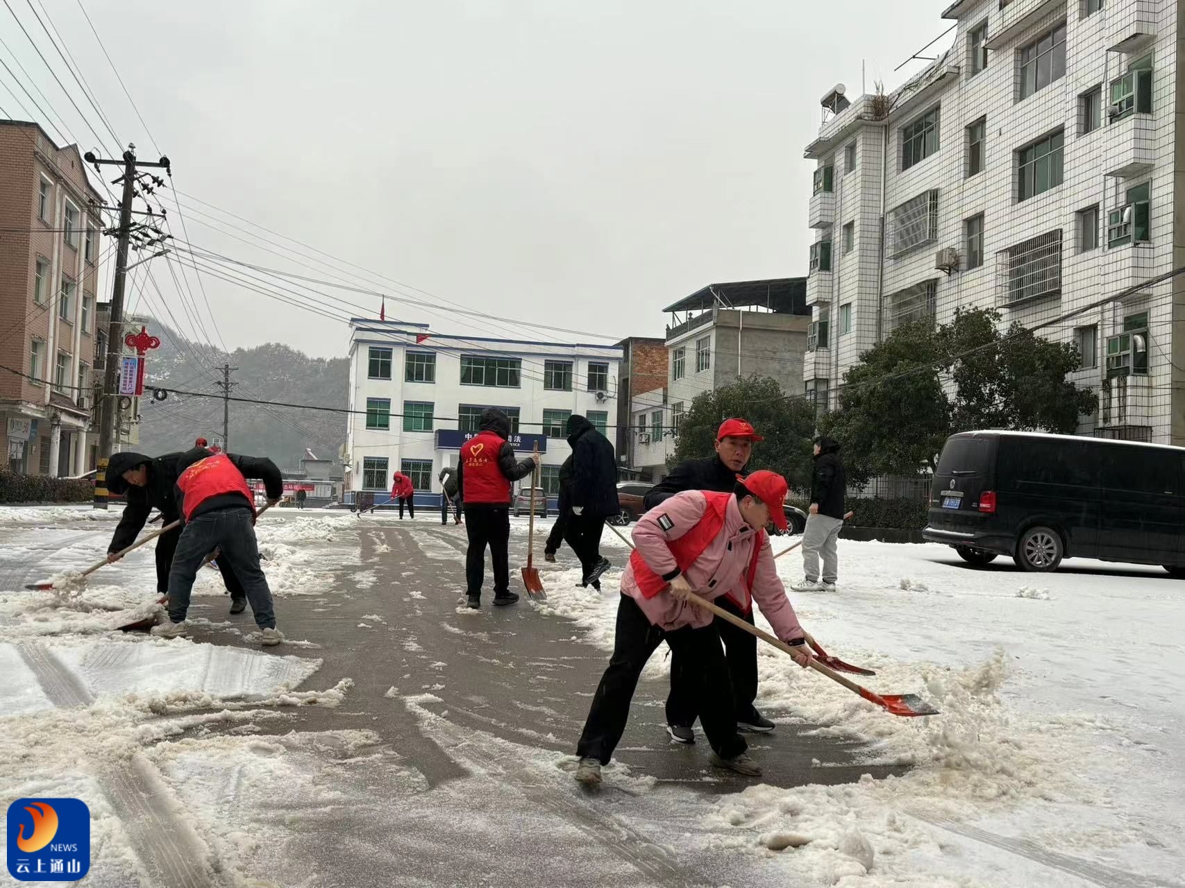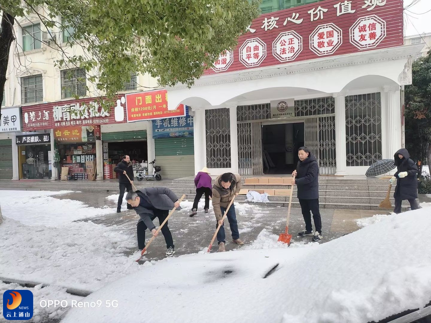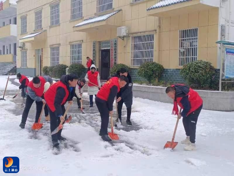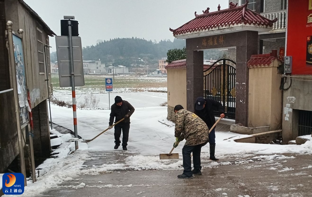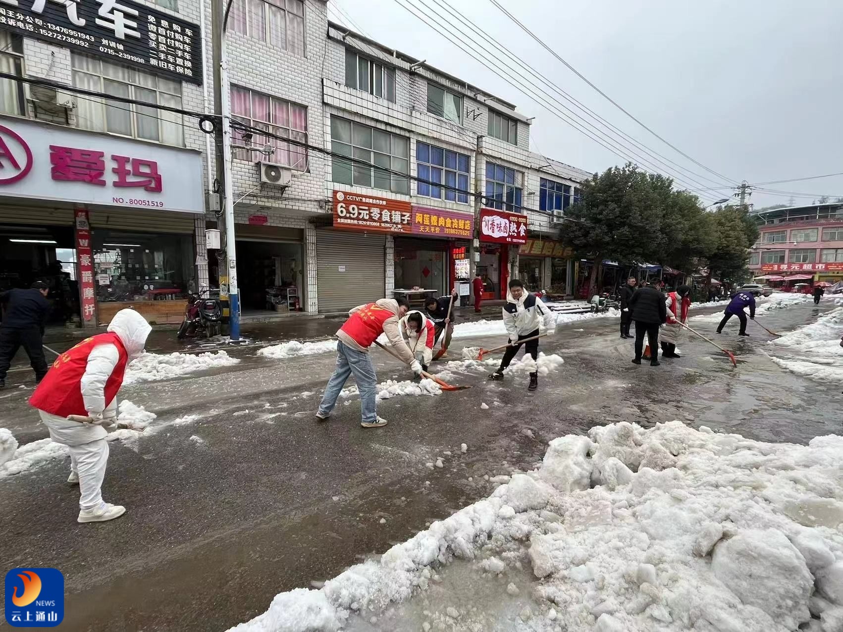 通山县通羊镇各村(社区)以动制“冻”,积极动员党员干部,志愿者清除道路积雪。