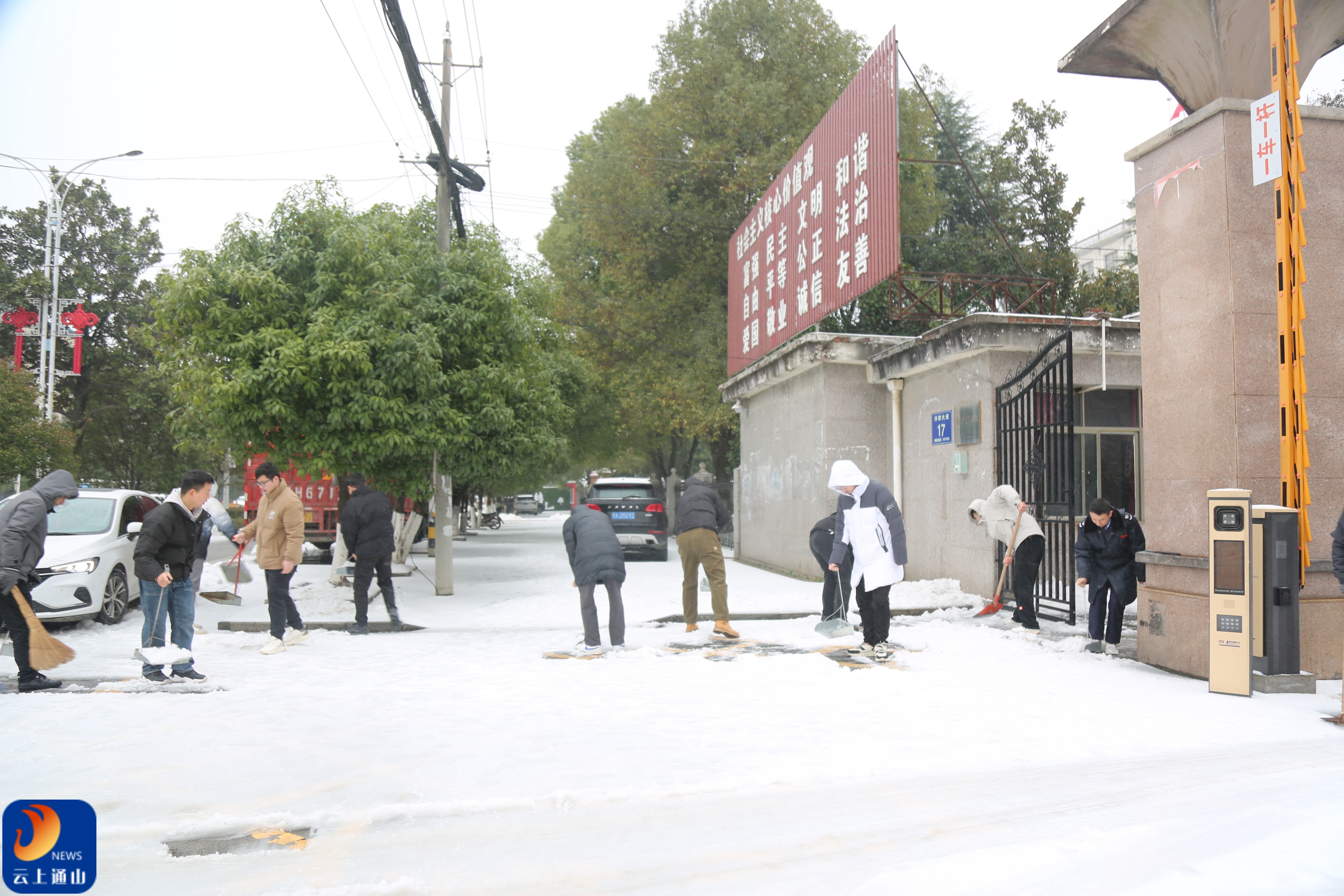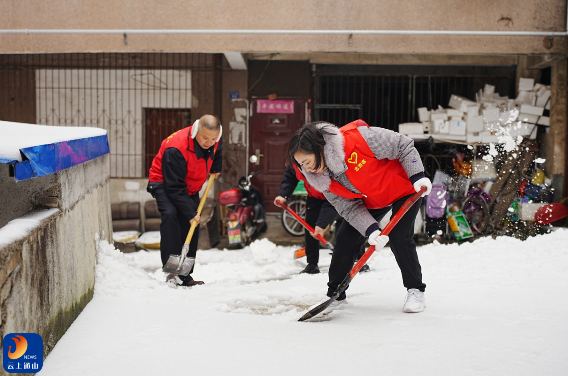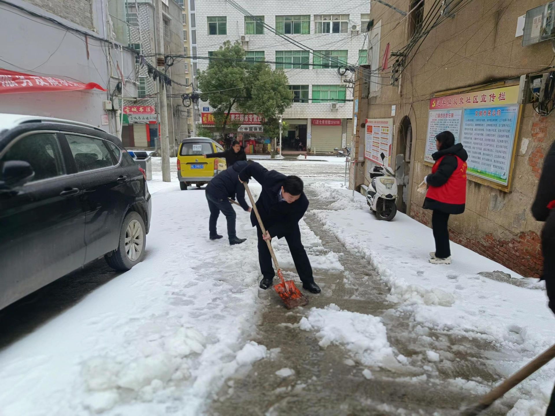 通山县委办公室组织党员干部在包保小区清理积雪。