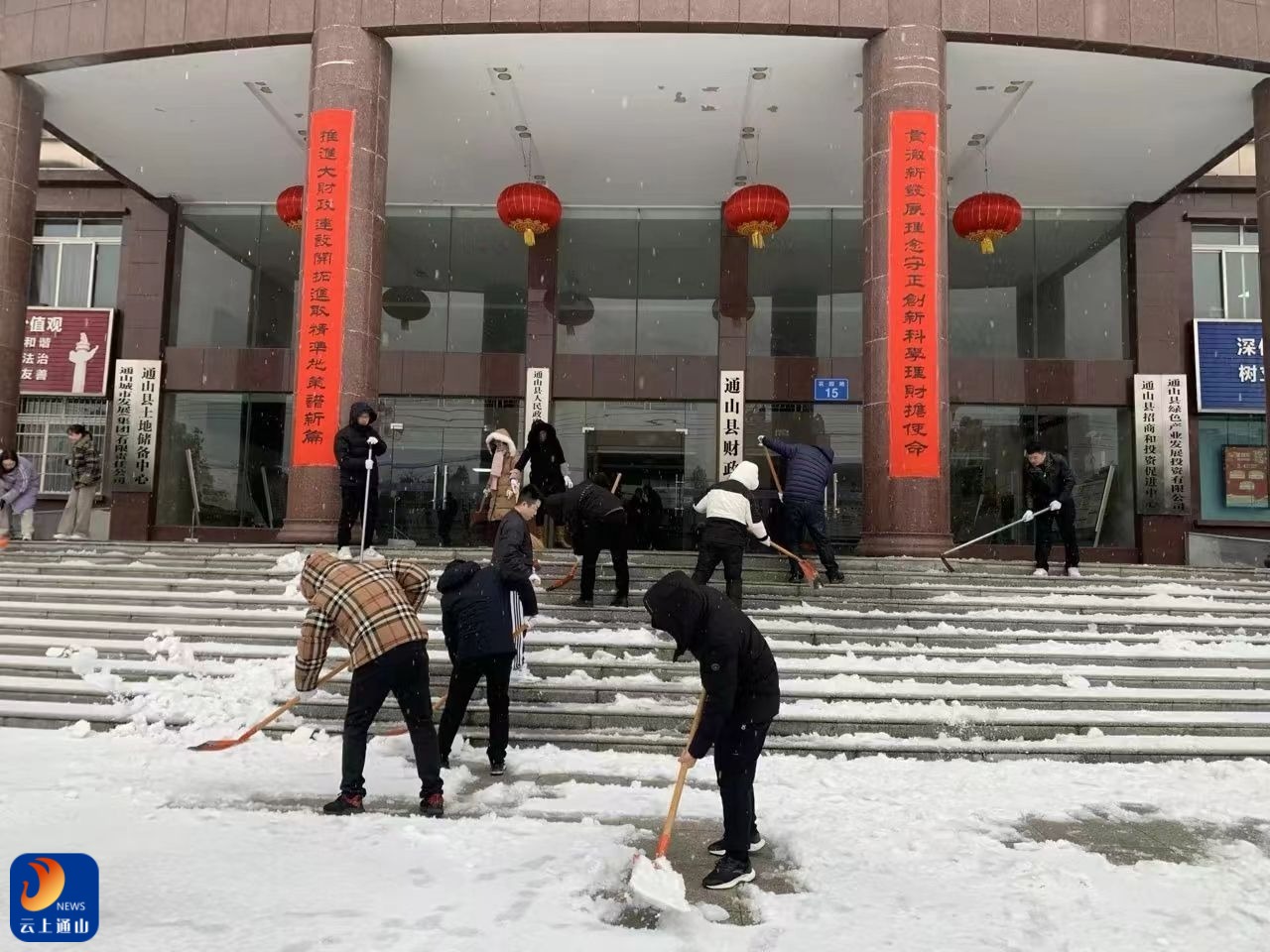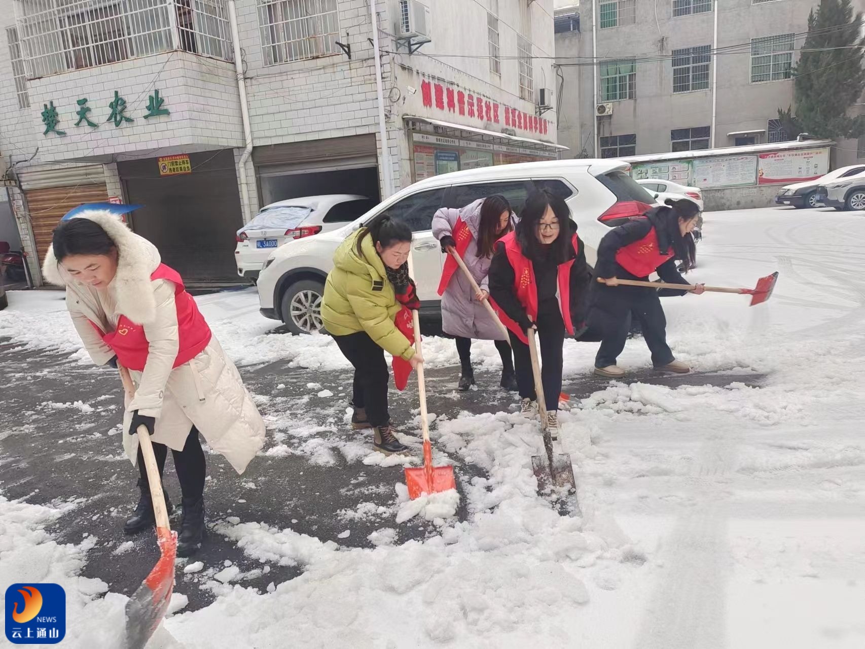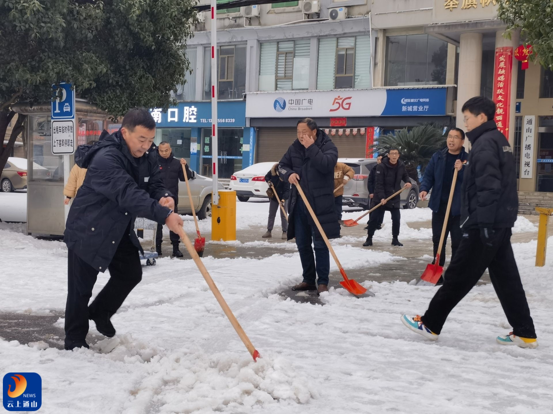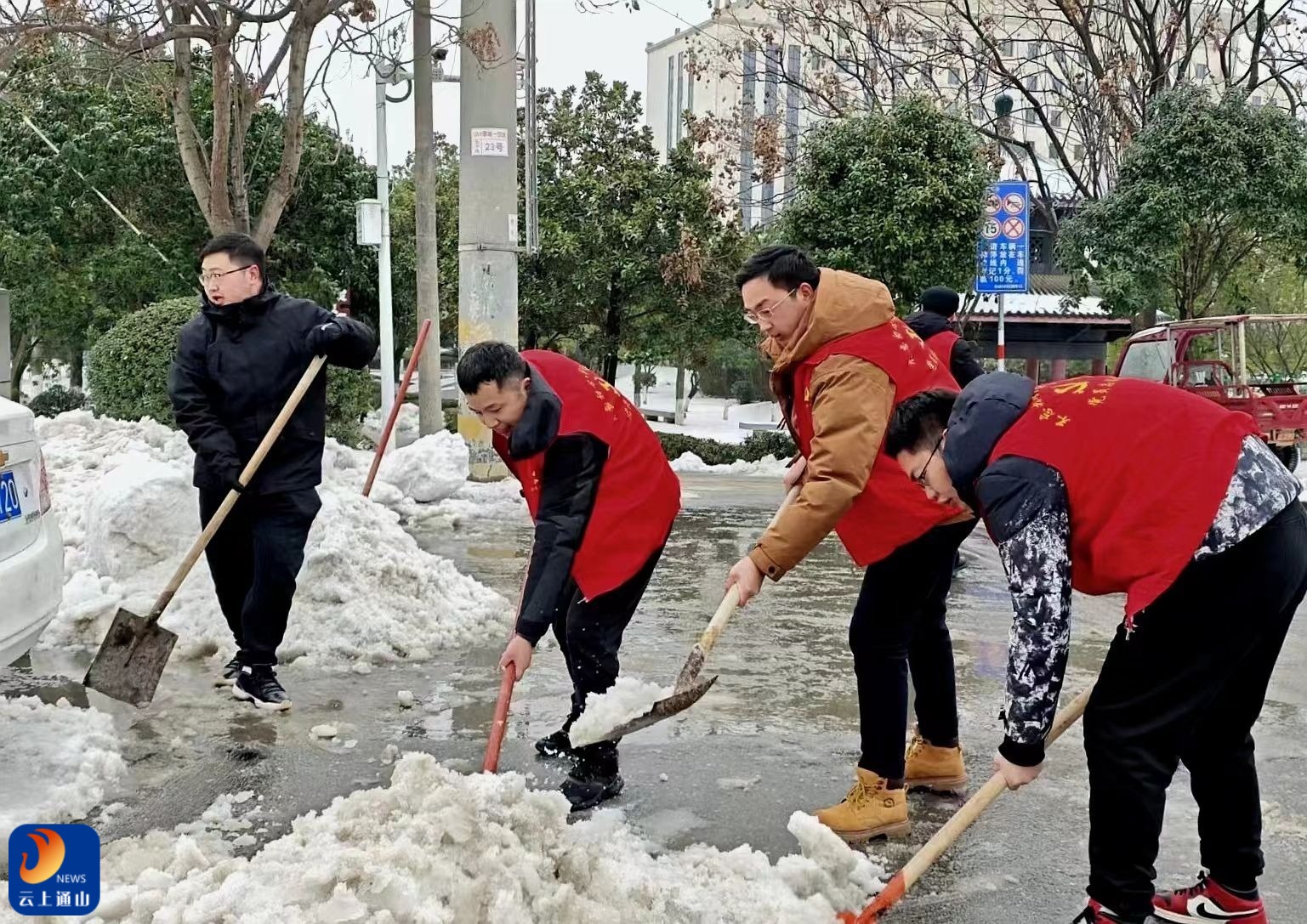 通山县委办公室组织党员干部在包保小区清理积雪。