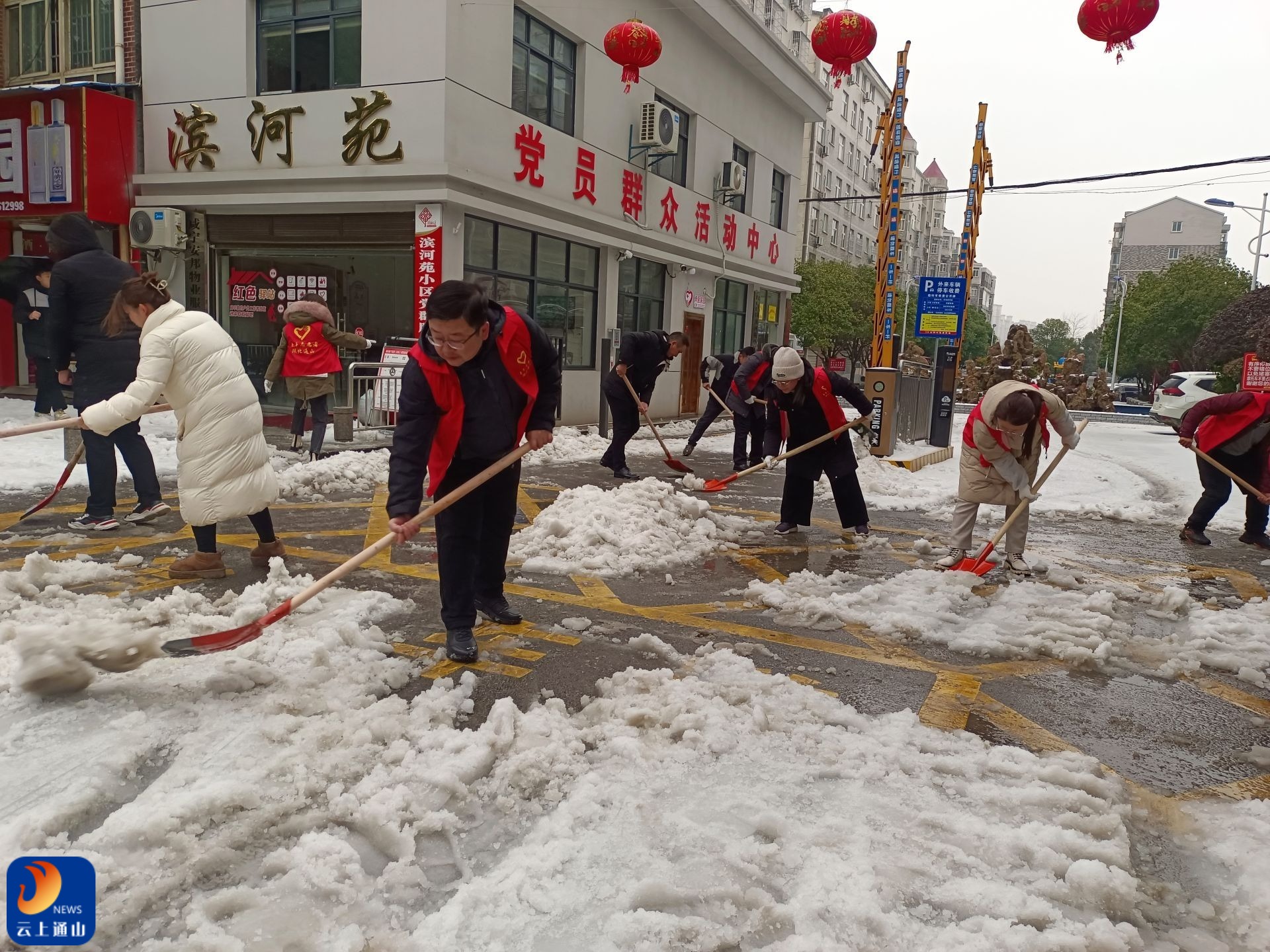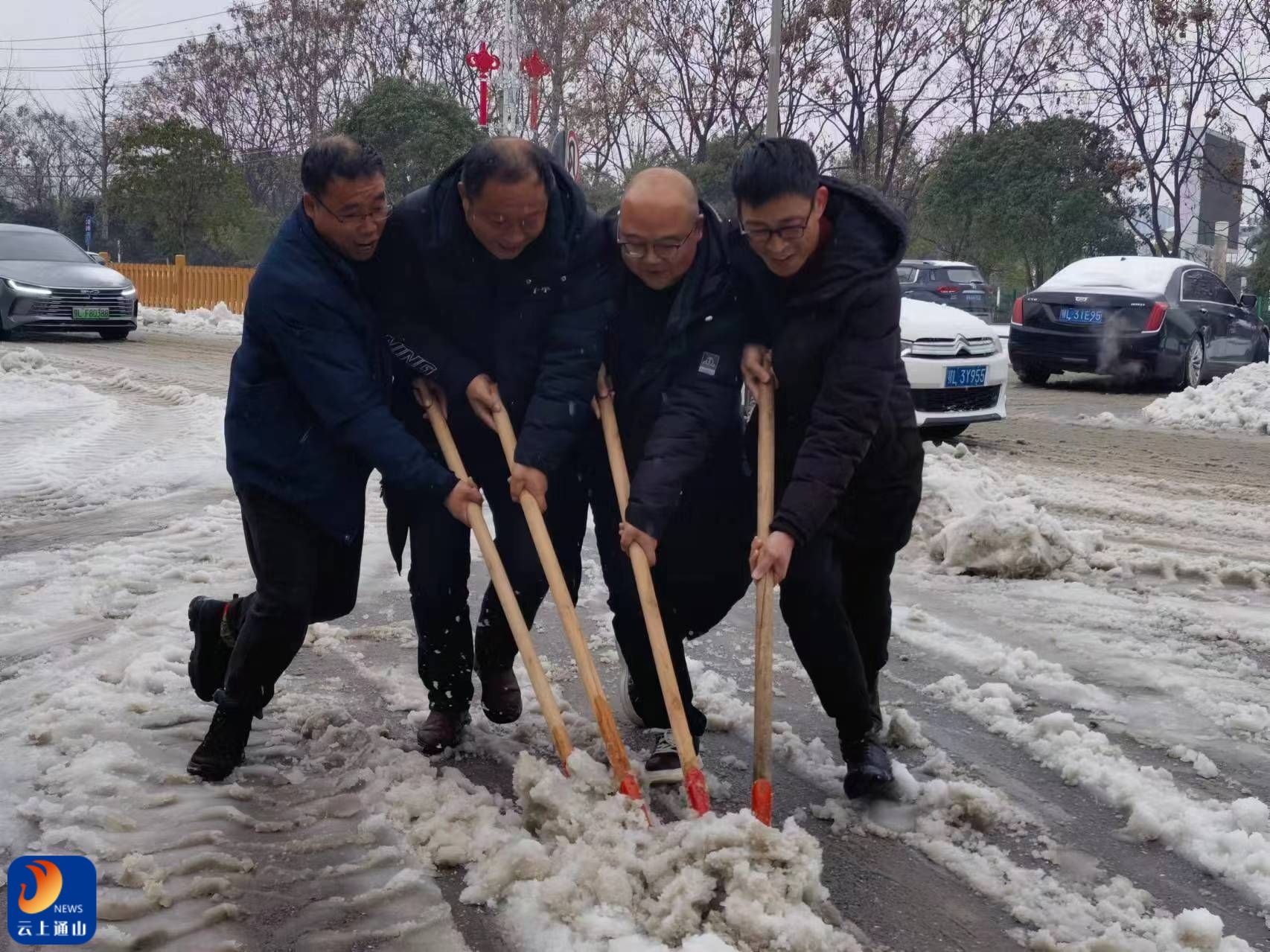 通山县委组织部组织机关党员干部在城区开展道路扫雪除冰工作。
