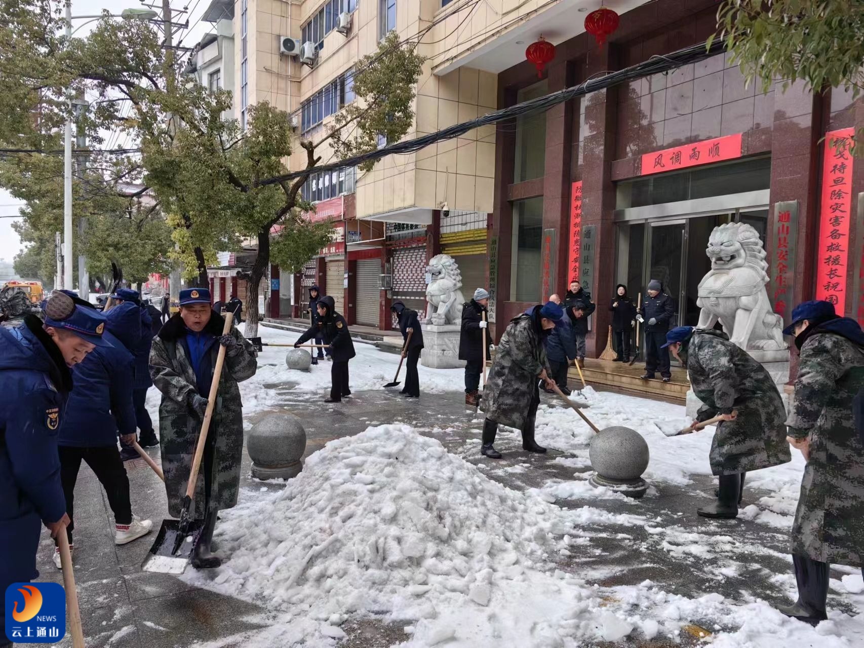 通山县厦铺镇镇直各单位、广大党员干部即刻行动,在厦铺镇镇区进行积雪清除。