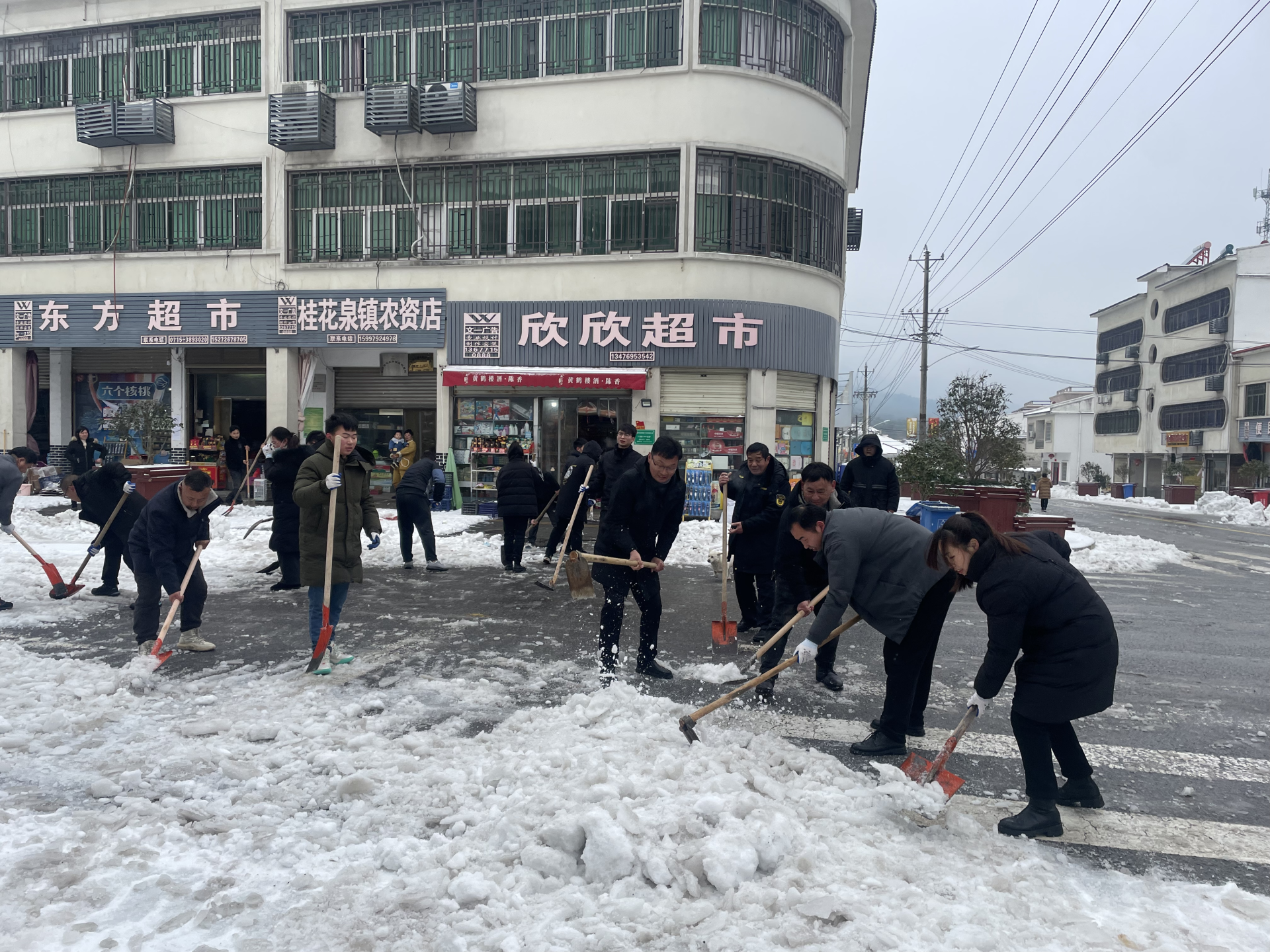 云上咸宁报道(通讯员 吴芹)2月21日晚至22日,崇阳县桂花泉镇出现强降雪天气,降水相态复杂,出现雨夹雪、冰粒、冻雨、纯雪并伴有雷电,致使镇域内道路结冰。为保障居民出行安全,桂花泉镇立即组织党员干部联合镇直各部门干部职工带上铁锹、铁铲等工具前往集镇主干道开展铲雪除冰行动,全力确保雨雪冰冻天气下集镇主干道安全、畅通。