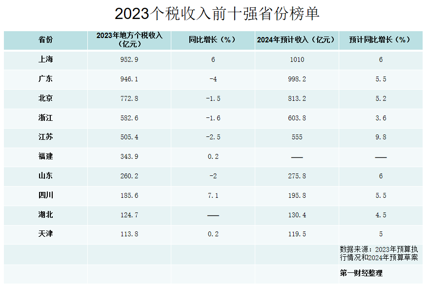 记者根据部分省份2023年预算执行情况和2024年预算草案等相关数据,整理出2023年地方个税收入前10强省份榜单。上海超过广东,以952.9亿元个税收入位居榜首;广东以946.1亿元紧随其后;北京以772.8亿元稳居第三。浙江、江苏均超500亿元;福建、山东超200亿元;四川、湖北、天津超百亿,其中湖北位居第九。