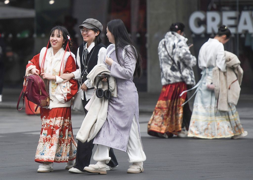 90后女孩杨锦是北京一家“新中式”服装品牌的主理人。今年春节期间,杨锦设计的一款以中国红为主色调的“新中式”上衣,成为店内的爆款商品。“这件衣服用料为红色漳缎,是一种非遗面料。在设计时,我融入了竹子、如意、祥云等图案,再搭配上经典盘扣,让这件衣服具有东方美学的独特韵味。”杨锦说。