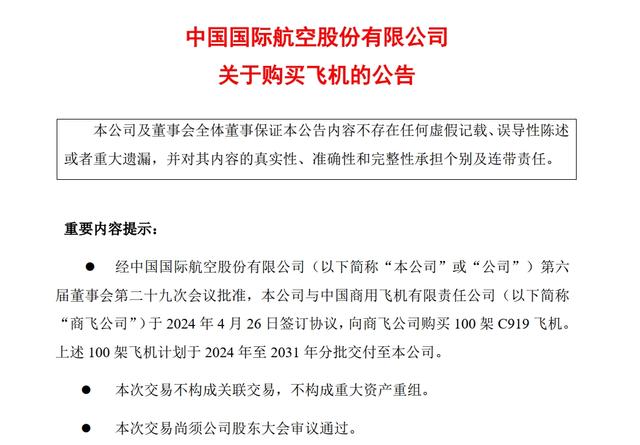 4月26日晚间,中国国航(sh601111,股价7.61元,市值1262.8亿元)公告,向商飞公司购买100架c919飞机,根据商飞公司提供的最新目录价格,基本价格合计约为108亿美元;经买卖双方公平谈判,商飞公司给予本公司购买飞机较大价格优惠。