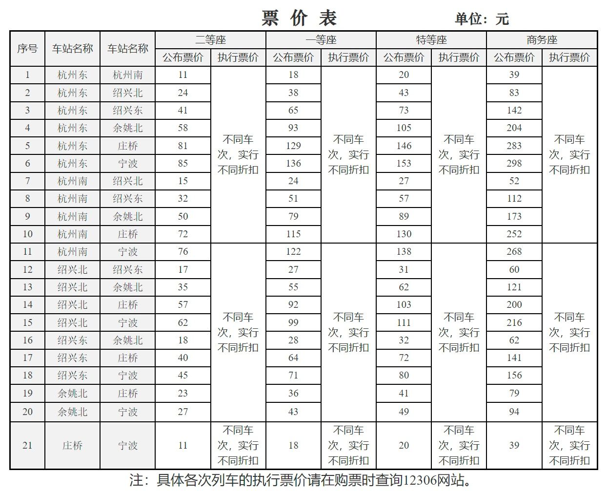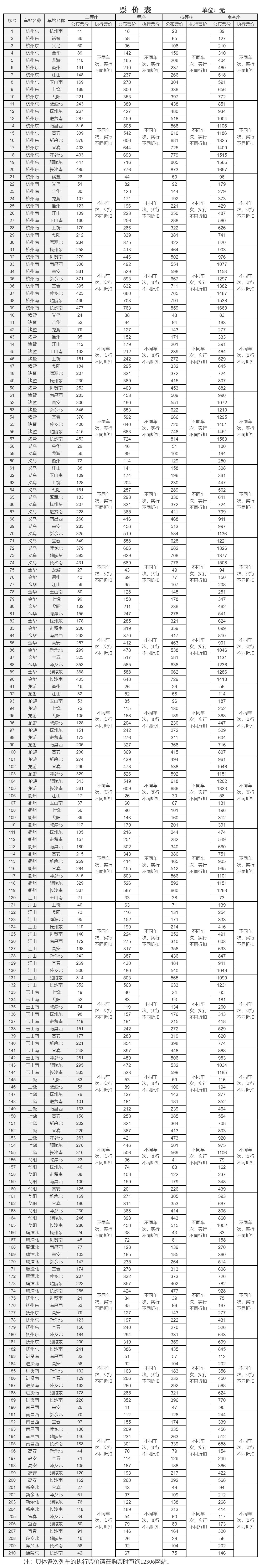 杭深铁路杭甬段票价表