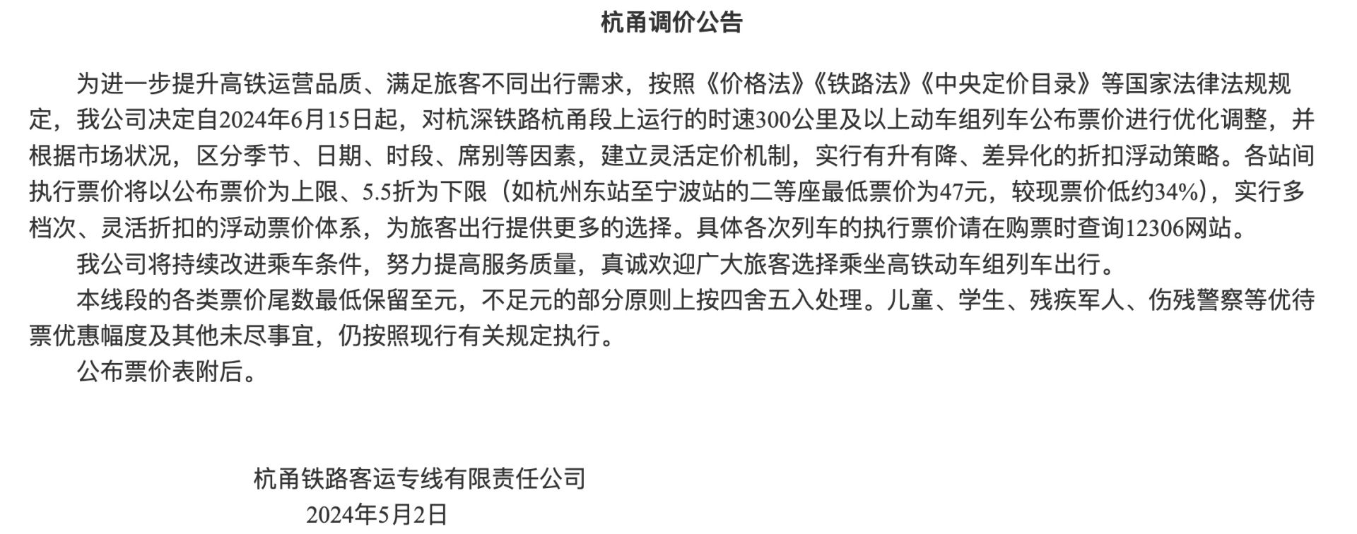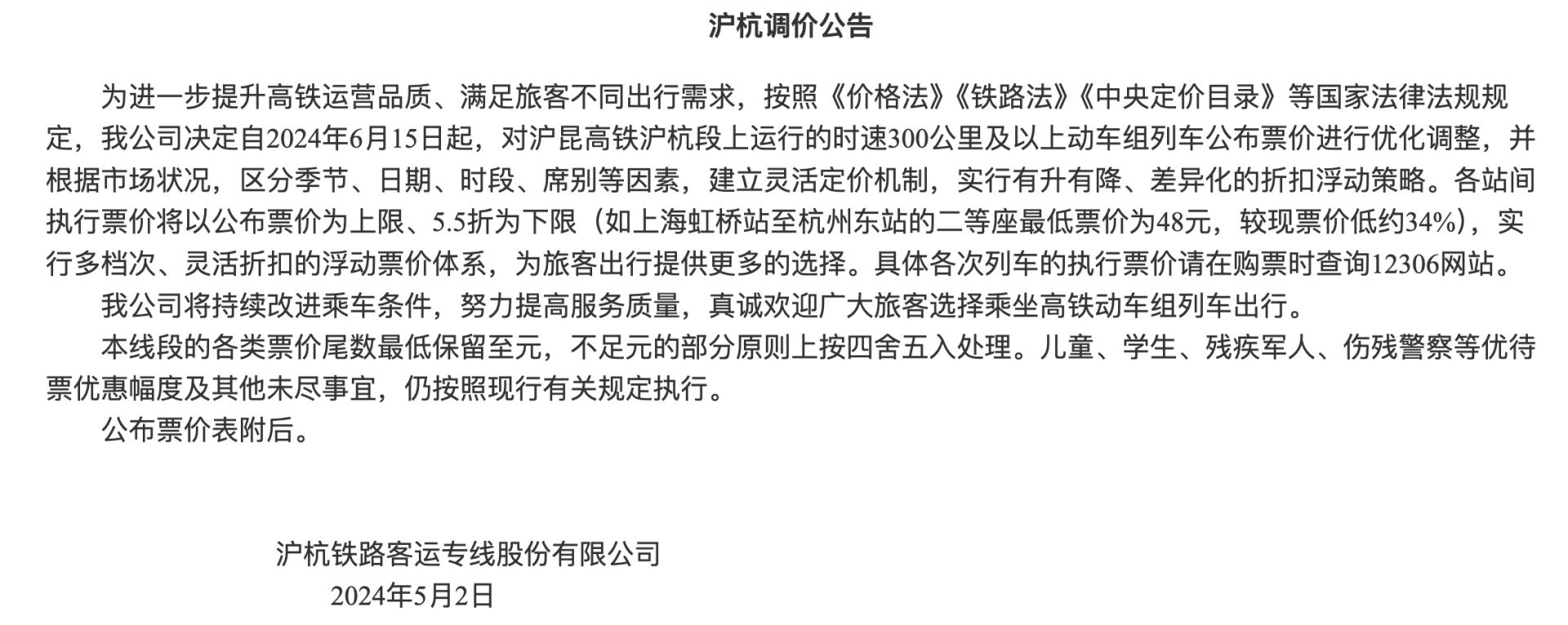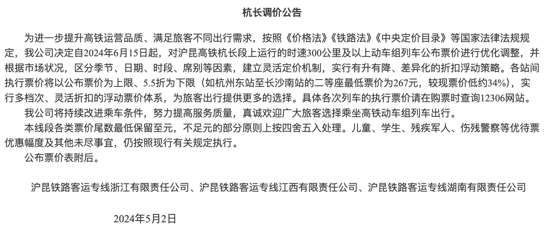 据武广铁路客运专线有限责任公司发布的武广调价公告显示,如武汉站至广州南站的二等座最低票价为304元,较现票价低约34%。据沪杭铁路客运专线股份有限公司发布的沪杭调价公告显示,如上海虹桥站至杭州东站的二等座最低票价为48元,较现票价低约34%。据沪昆铁路客运专线浙江有限责任公司、沪昆铁路客运专线江西有限责任公司、沪昆铁路客运专线湖南有限责任公司发布的杭长调价公告显示,如杭州东站至长沙南站的二等座最低票价为267元,较现票价低约34%。据杭甬铁路客运专线有限责任公司发布的杭甬调价公告显示,如杭州东站至宁波站的二等座最低票价为47元,较现票价低约34%。