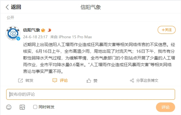 6月18日,信阳市气象局发布通报:全市气象部门的个别站点开展了少量的人工增雨作业,全市平均降水量0.6毫米,“人工增雨作业造成狂风暴雨灾害”等相关网络言论与事实严重不符。