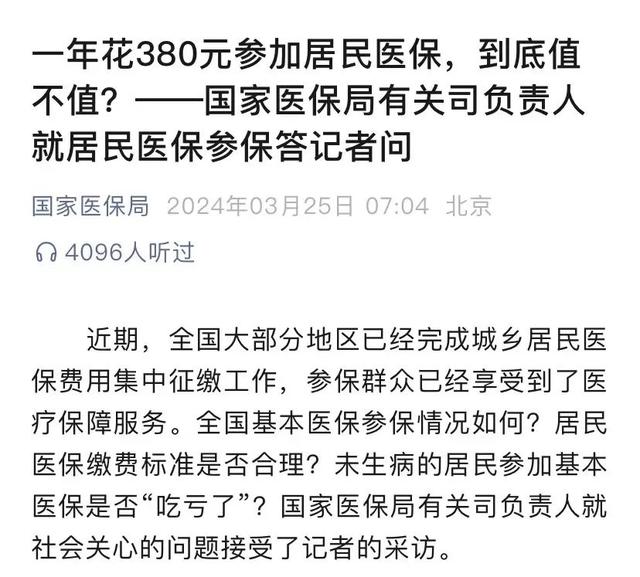2023年我国城乡居民医保个人缴费标准为380元。一年花380元参加居民医保,到底值不值?全国基本医保参保情况如何?未生病的居民参加基本医保是否“吃亏了”?2024年3月,国家医保局有关司负责人曾就居民医保参保答记者问。