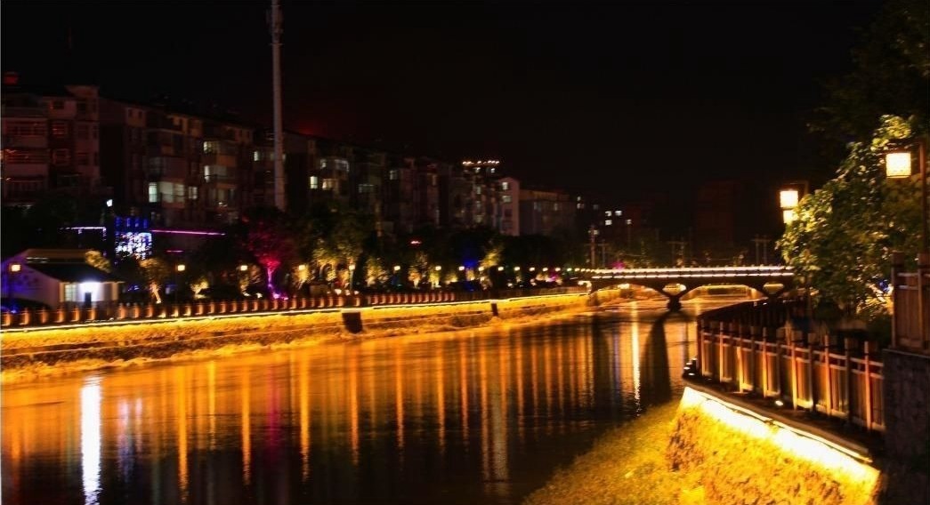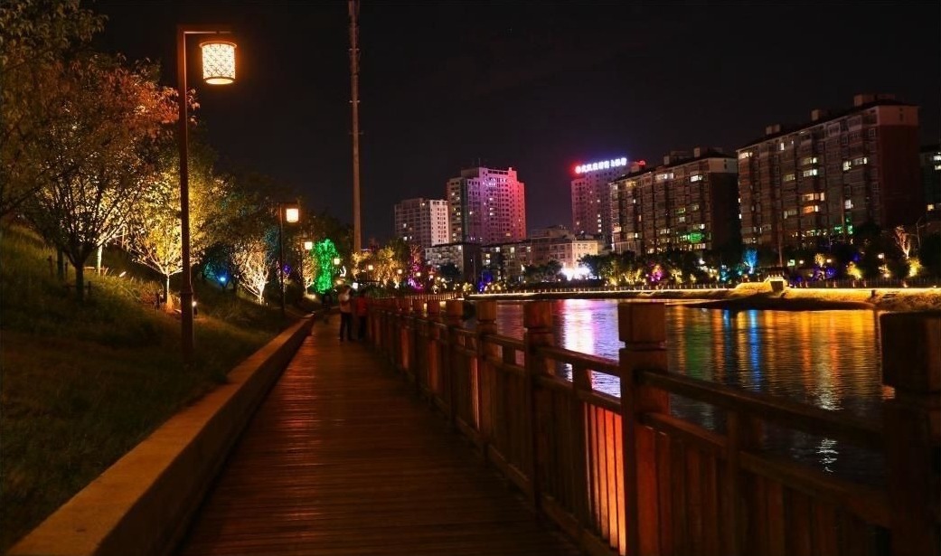 ▲夜幕低垂,河边灯光闪烁,映照在静谧的水面上