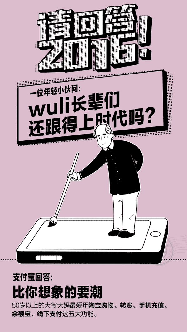“老” = out?才不是。在支付宝最高等级会员(钻石会员)中,超过50岁的会员有2503位。除了淘宝和转账,他们最喜欢的服务是“手机充值”,不用下雨天跑营业厅了。“孩子再也不用担心我停机了”。