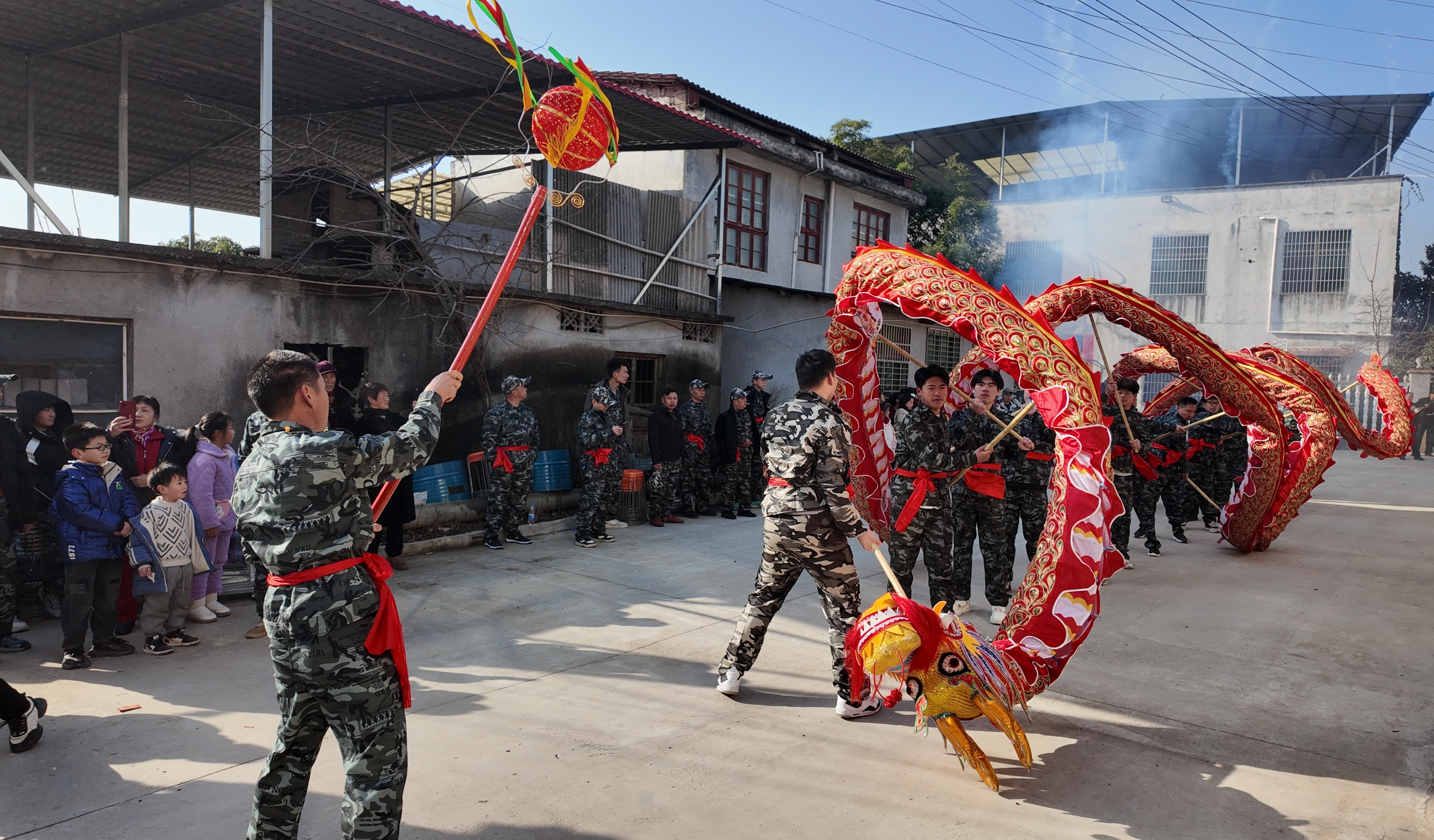 上午9时,伴随着铿锵的锣鼓声,村民们身披节日的盛装,在村前的村舍院落舞起了龙灯,用这一古朴而又传统的方式祈福新春。