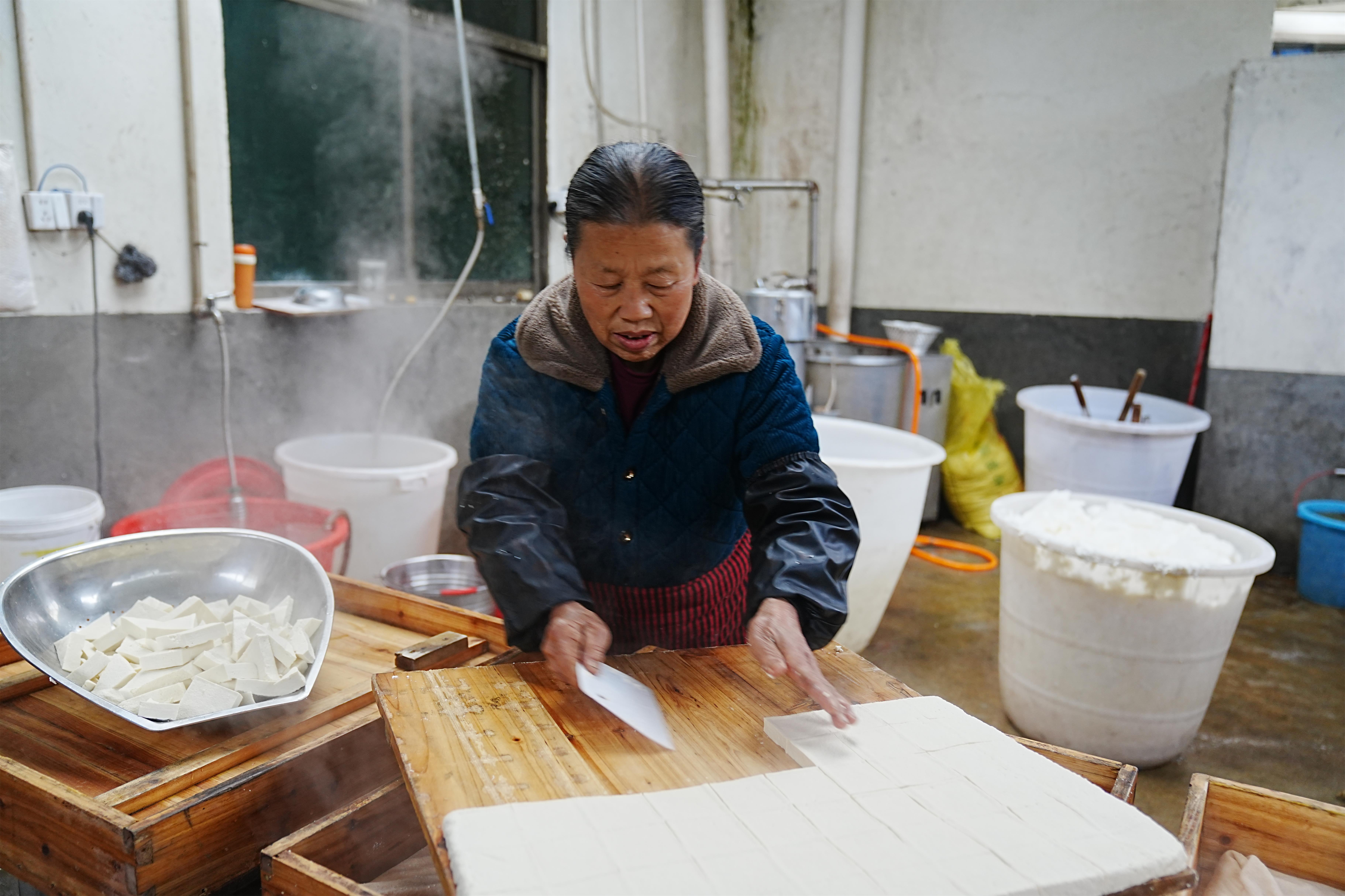 崇阳县高枧乡中山村是远近闻名的“豆腐村”,该村坚持党建引领,大力发展豆腐产业,一块块小豆腐铺就出一幅幅产业兴盛的乡村振兴和美画卷。这位大妈已年近70岁,但是切豆腐的动作依旧娴熟,“我们这个村因豆腐而闻名,像我这样在赋闲在家的女性有不少,大家通过制作豆腐来获得收入,同时也能够照顾家庭,真是两全其美。”大妈笑着说道。