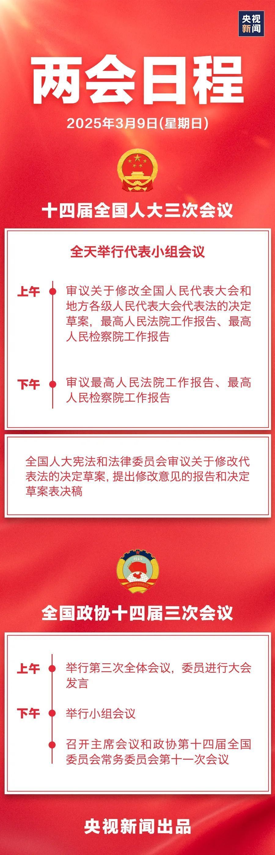 十四届全国人大三次会议9日全天举行代表小组会议。上午,审议关于修改全国人民代表大会和地方各级人民代表大会代表法的决定草案,最高人民法院工作报告、最高人民检察院工作报告;下午,审议最高人民法院工作报告、最高人民检察院工作报告。