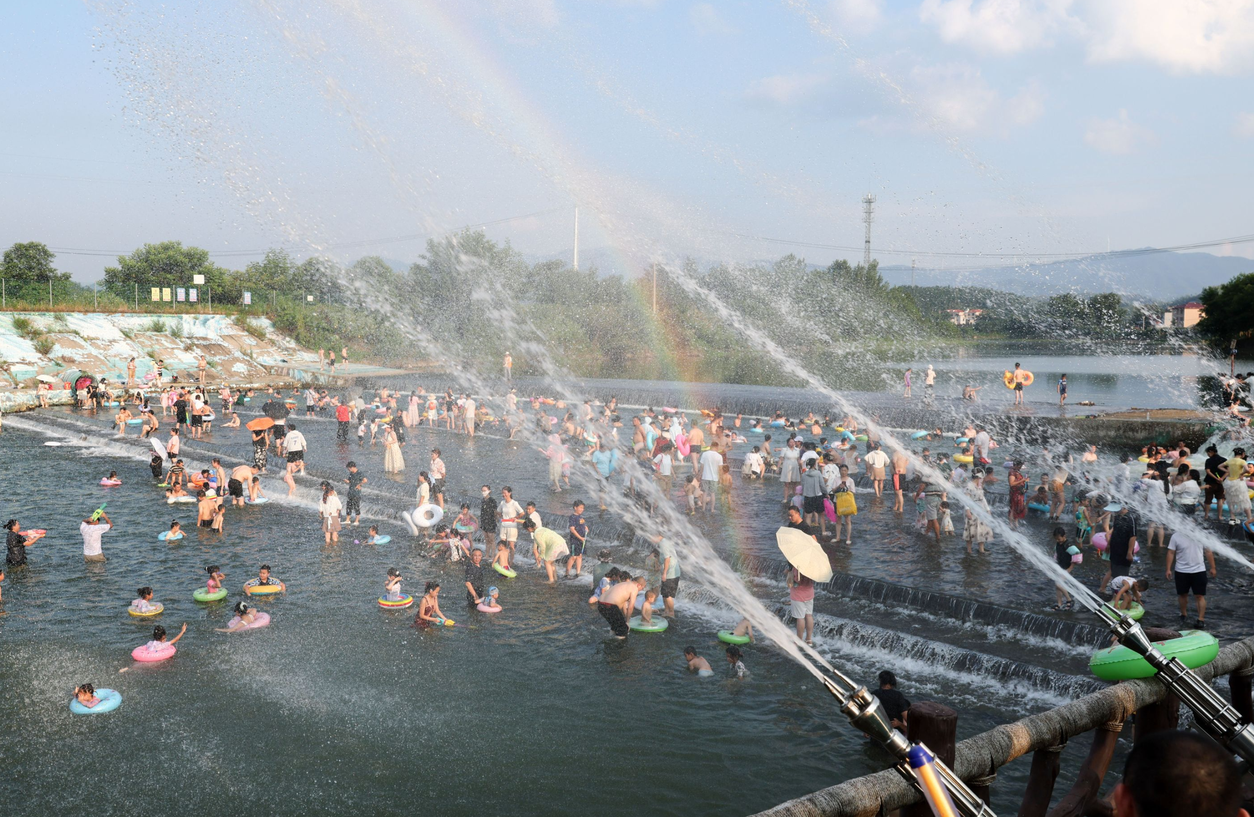 活动首日,占地2000平方米的网红河嬉水区便迎来客流高峰。记者在现场看到,水域采用阶梯式分级设计,配备专业救生团队,沿线设置完善的便民设施。环形喷雾水幕秋千、加特林水枪矩阵等特色项目深受亲子家庭欢迎,室内文创工坊的非遗手绘扇、竹编体验等活动同样人气高涨。