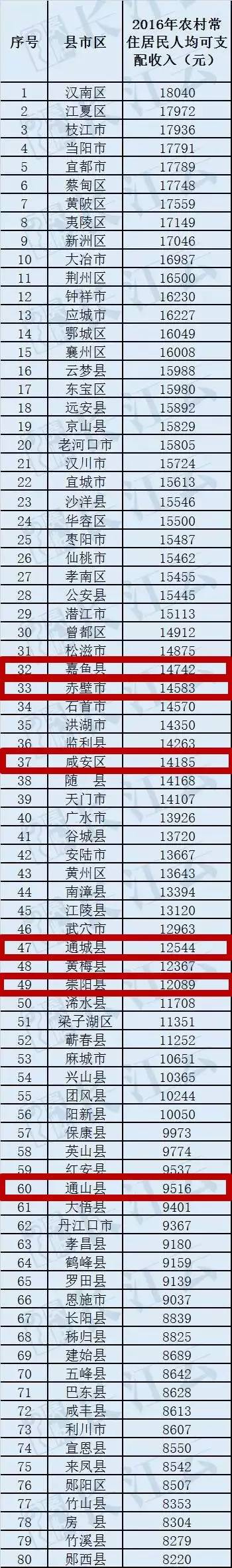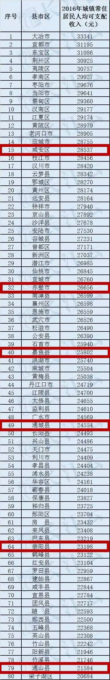 《2016年湖北省县域经济工作考核报告》列出了湖北80个县(市、区)2016年居民人均可支配收入数据。