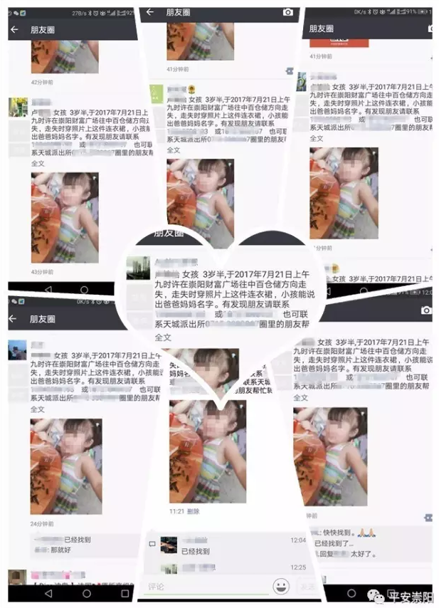 21日上午,一条“寻找走失女童小怡”的信息在崇阳本地各微信群和朋友圈中迅速传播,从第一条朋友圈发出,到获得线索,仅用了20分钟就找回已经走丢近3个小时的小怡。