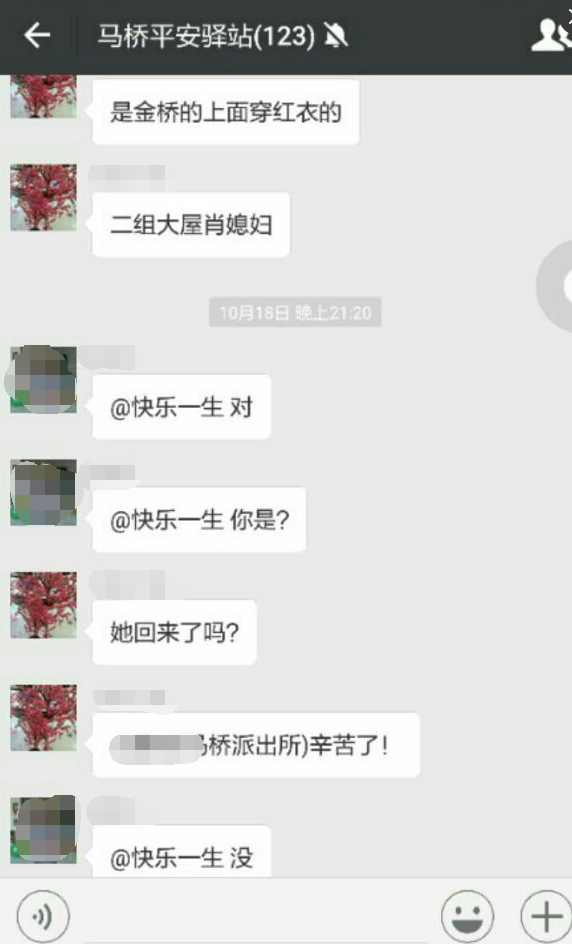 马桥派出所值班民警耐心询问红衣女子的情况,但是问了一个多小时,该女子始终一言不发。急中生智的民警拍下红衣女子的照片,上传到“平安驿站”微信群里求助,不出1分钟,微信群里就有了回复,金桥村治安积极分子陈某认出该女子姓朱,是金桥村人;金桥村干部看到信息后,联系上了朱某的丈夫陈某。长期在温泉某酒店打工的陈某得知情况后,与姑姑一同来到马桥派出所,将朱某接回了家。