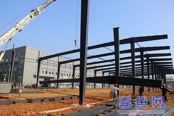 10月30日,在咸宁国家高新区嘉鱼创业孵化园宇兆能源科技有限公司施工现场,工人们正忙着搭设钢架结构厂房。