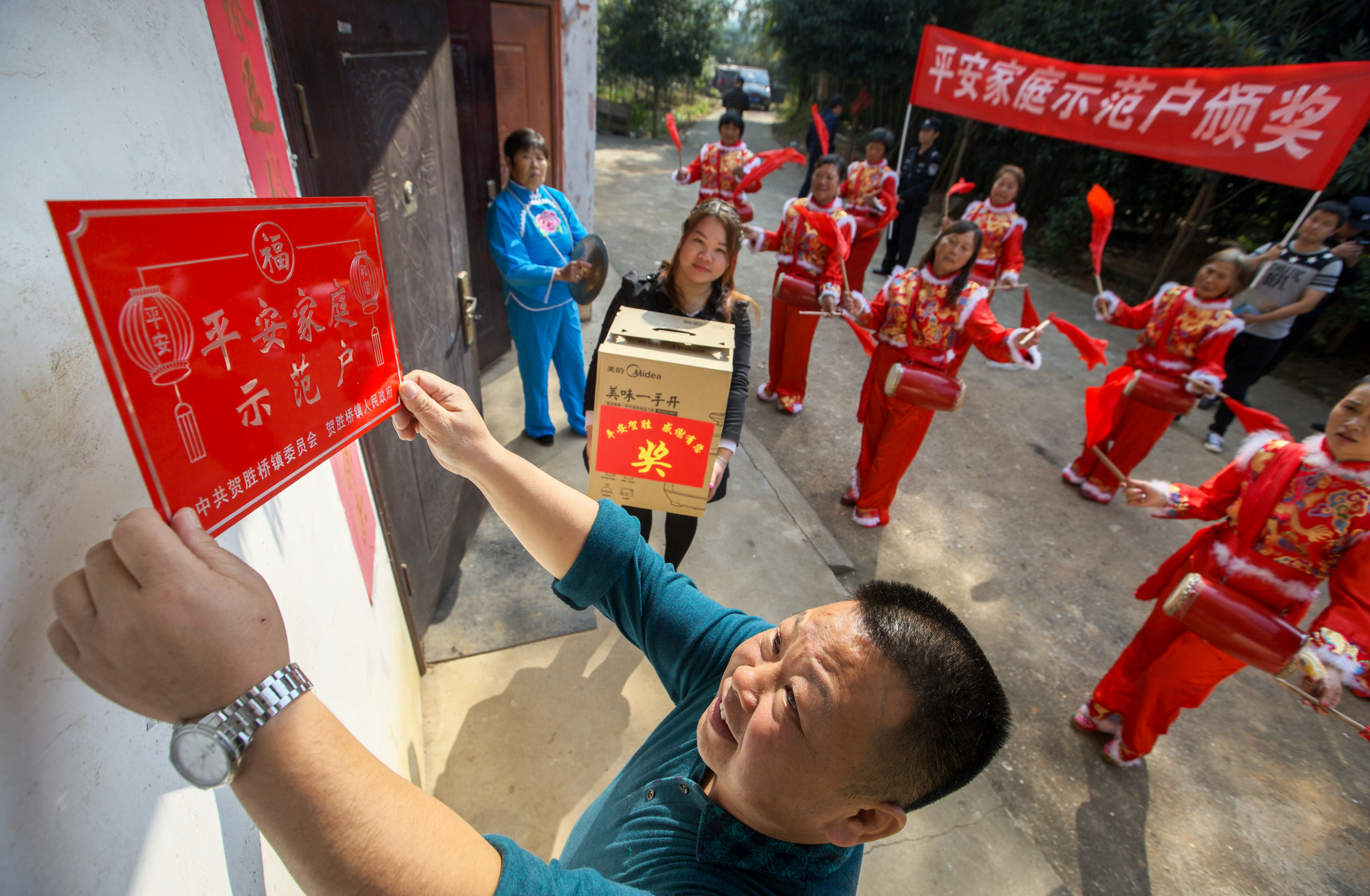 11月3日,咸安区贺胜桥镇开展平安家庭示范户颁奖活动,镇人大、综治办一行敲锣打鼓进入村组和社区,为贺胜社区、贺胜茶场、桃林村,27户平安家庭示范户授牌,锣鼓声、平安创建宣传车的广播声传遍乡村和社区,营造出了满满的平安创建氛围。